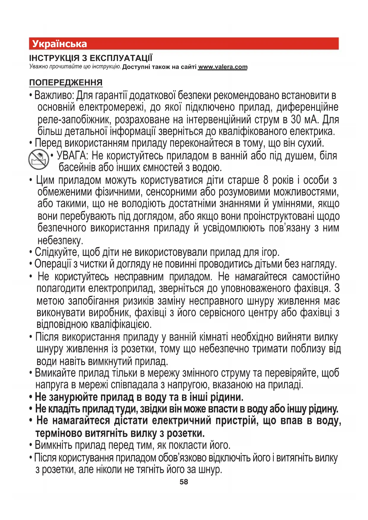 - УВАГА: Не користуйтесь приладом в ванній або під душем, біля басейнів або інших ємностей з водою.