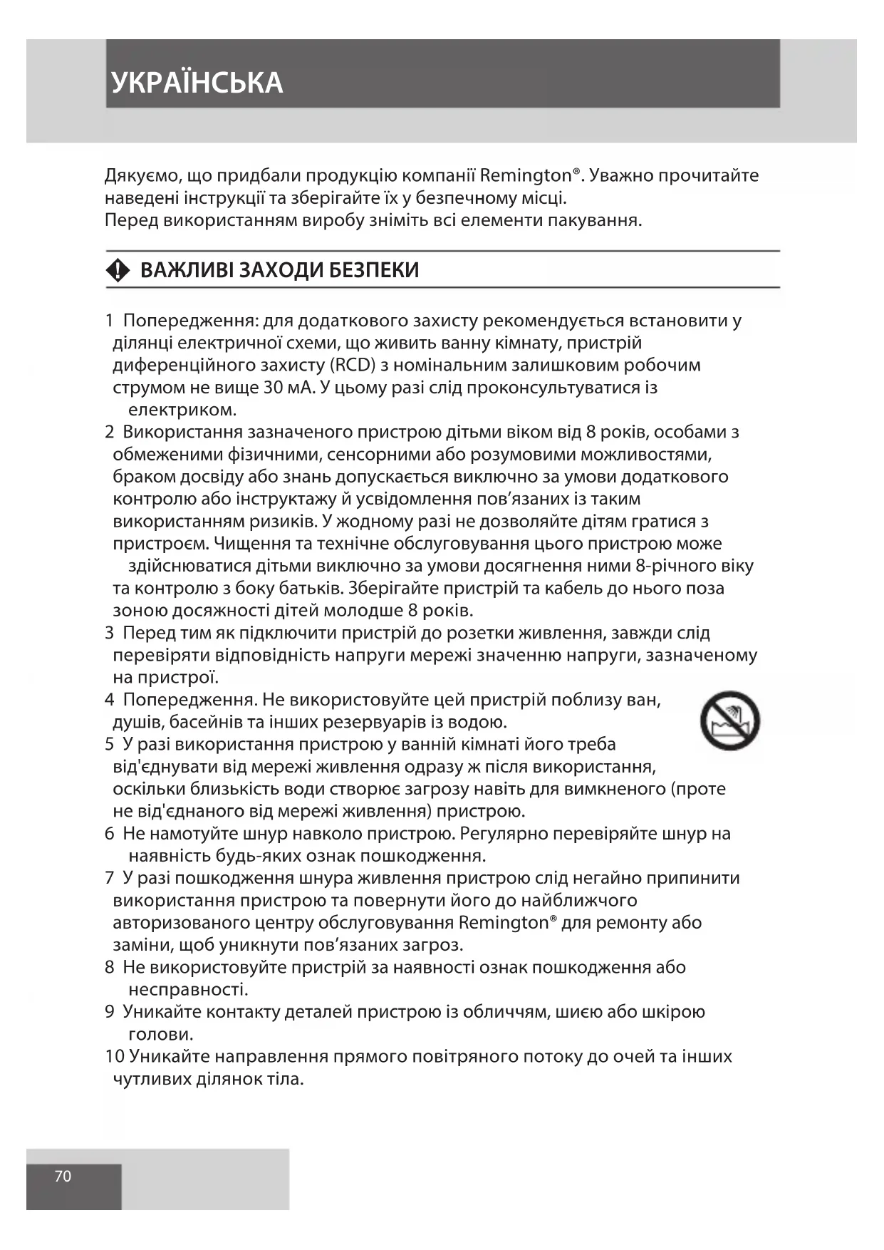 7 Si le cordon d'alimentation de cet apparéil est endommagé, cessez immédiatement d'utiliser l' apparéil et renvoyez-le au service consommateurs Remington agréé le plus proche en vue de sa réparation ou de sa substitution afin d'éviter tout risque.