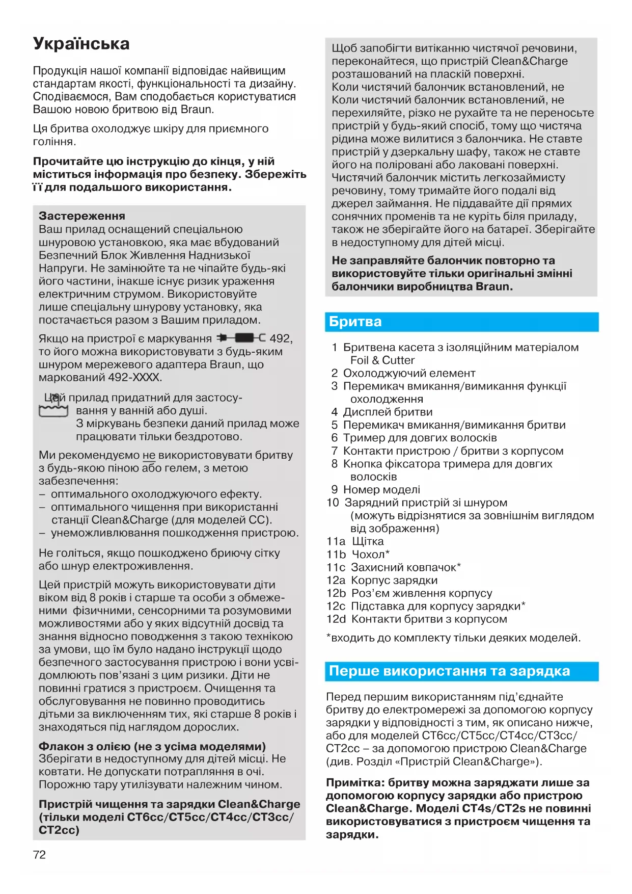 Прочитайте цю інструкцію до кінця, у ній міститься інформація про безпеку. Збережіть ї ї для подальшого використання. Застереження Ваш прилад оснащений спеціальною шнуровою установкою, яка має вбудований Безпечний Блок Живлення Наднизької Напруги. Не замінюйте та не чіпайте будь-які його частини, інакше існує ризик ураження електричним струмом. Використовуйте лише спеціальну шнурову установку, яка постачається разом з Вашим приладом. Якщо на пристрої є маркування 492, то його можна використовувати з будь-яким шнуром мережевого адаптера Braun, що маркований 492-ХХХХ. Цей прилад придатний для застосу- вання у ванній або душі. З міркувань безпеки даний прилад може працювати тільки бездротово. Ми рекомендуємо не використовувати бритву з будь-якою піною або гелем, з метою забезпечення: – оптимального охолоджуючого ефекту. – оптимального чищення при використанні станції Clean&Charge (для моделей СС). – унеможливлювання пошкодження пристрою. Не голіться, якщо пошкоджено бриючу сітку або шнур електроживлення. Цей пристрій можуть використовувати діти віком від 8 років і старше та особи з обмеже- ними фізичними, сенсорними та розумовими можливостями або у яких відсутній досвід та знання відносно поводження з такою технікою за умови, що їм було надано інструкції щодо безпечного застосування пристрою і вони усві- домлюють пов’язані з цим ризики. Діти не повинні гратися з пристроєм. Очищення та обслуговування не повинно проводитись дітьми за виключенням тих, які старше 8 років і знаходяться під наглядом дорослих. Флакон з олією (не з усіма моделями) Зберігати в недоступному для дітей місці. Не ковтати. Не допускати потрапляння в очі. Порожню тару утилізувати належним чином. Пристрій чищення та зарядки Clean&Charge (тільки моделі CT6cc/CT5cc/CT4cc/CT3cc/ CT2cc) Щоб запобігти витіканню чистячої речовини, переконайтеся, що пристрій Clean&Charge розташований на пласкій поверхні. Коли чистячий балончик встановлений, не Коли чистячий балончик встановлений, не перехиляйте, різко не рухайте та не переносьте пристрій у будь-який спосіб, тому що чистяча рідина може вилитися з балончика. Не ставте пристрій у дзеркальну шафу, також не ставте його на поліровані або лаковані поверхні. Чистячий балончик містить легкозаймисту речовину, тому тримайте його подалі від джерел займання. Не піддавайте дії прямих сонячних променів та не куріть біля приладу, також не зберігайте його на батареї. Зберігайте в недоступному для дітей місці. Не заправляйте балончик повторно та використовуйте тільки оригінальні змінні балончики виробництва Braun.