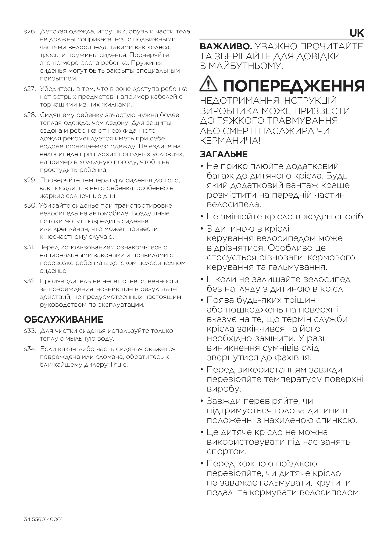 s27. Переконайтеся, що дитина не зможе дотягнутися до гострих предметів, наприклад до зношених кабелів. s28. Дітей, які сидять у кріслі, часто потрібно вдягати тепліше за того, хто везе. Щоб захисти себе та свою дитину від неочікуваного дощу, радимо мати із собою водонепроникний одяг. Ніколи не виїжджайте за несприятливих погодних умов, наприклад у холодну погоду, щоб дитина не змерзла або не обморозилася. s29. Перевіряйте температуру поверхні крісла, перш ніж садити в нього дитину, особливо в сонячні та спекотні дні. s30. Знімайте дитяче крісло, коли перевозите велосипед на автомобілі. Сильний потік повітря може завдати кріслу шкоди або ослабити його кріплення, що може призвести донещасного випадку. s31. Перед використанням перевірте, чиє у вашій країні закони та правила перевезення дітей у велосипедних дитячих кріслах. s32. Виробник не несе відповідальності за пошкодження, спричинені недотриманням рекомендацій щодо використання, наведених у цьому посібнику користувача.