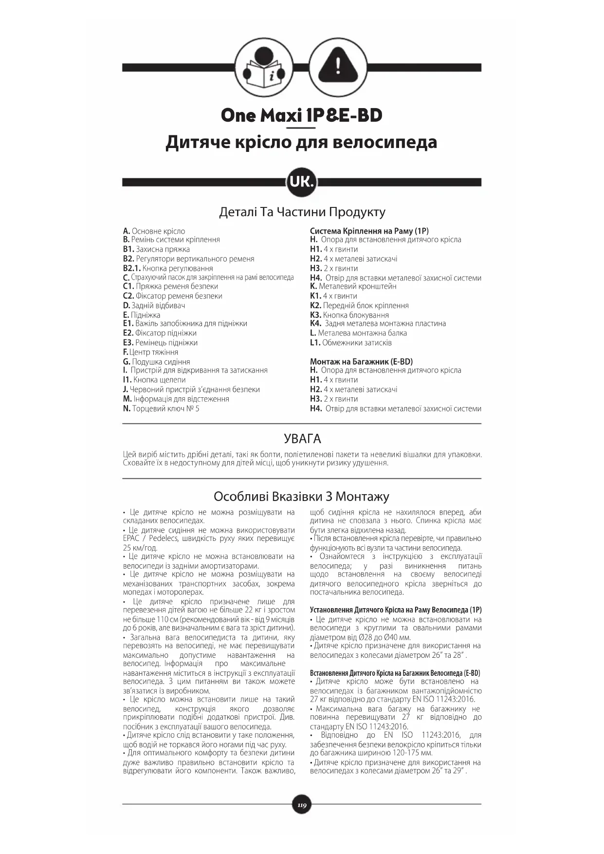 - Дитяче крісло призначене для використання на велосипедах з колесами діаметром 26” та 29” . Деталі Та Частини Продукту Особливі Вказівки З Монтажу One Maxi 1P&E-BD Дитяче крісло для велосипеда Цей виріб містить дрібні деталі, такі як болти, поліетиленові пакети та невеликі вішалки для упаковки. Сховайте їх в недоступному для дітей місці, щоб уникнути ризику удушення. УВАГА120