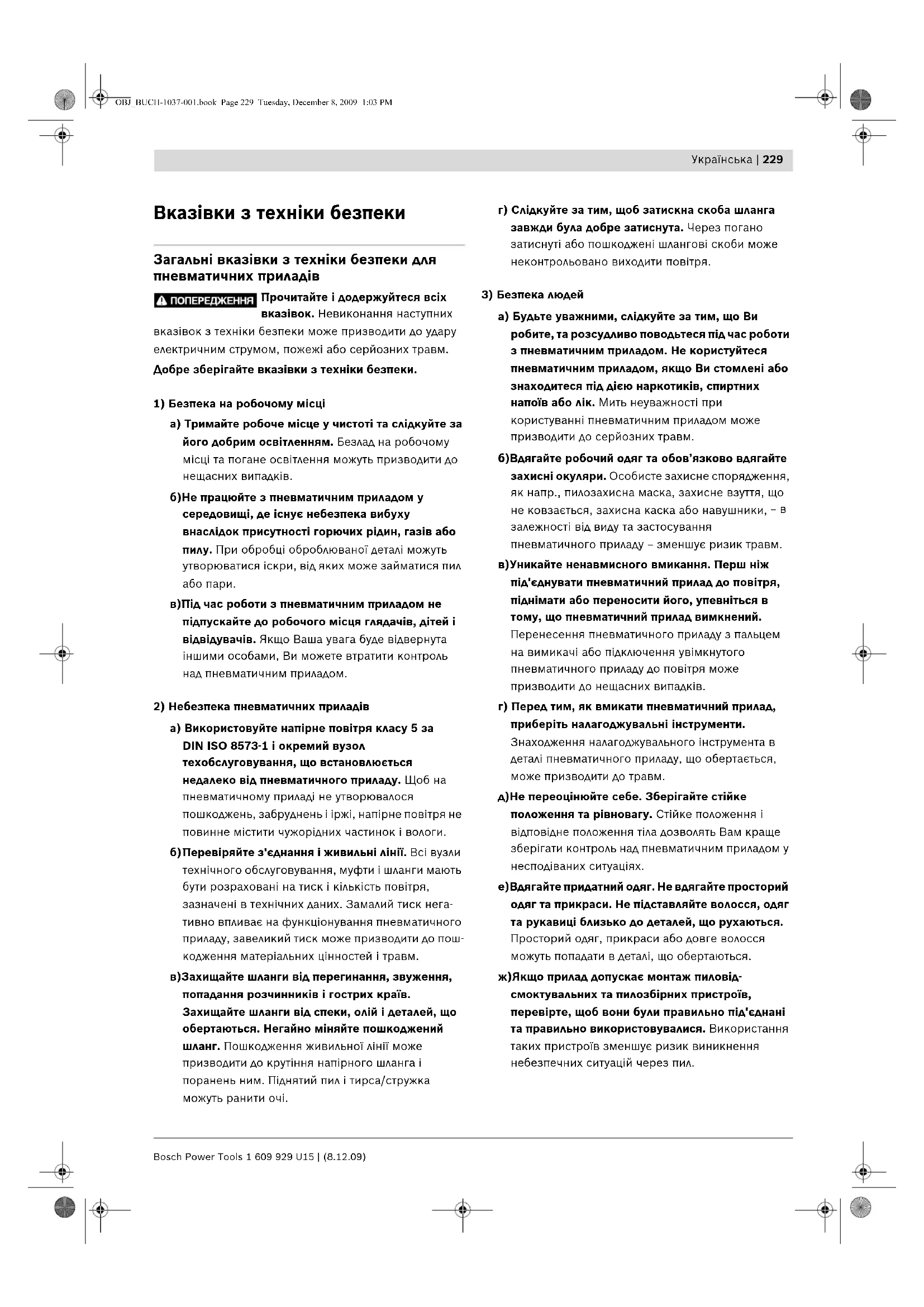 залежності від виду та застосування пневматичного приладу – зменшує ризик травм. в)Уникайте ненавмисного вмикання. Перш ніж під'єднувати пневматичний прилад до повітря, піднімати або переносити його, упевніться в тому, що пневматичний прилад вимкнений. Перенесення пневматичного приладу з пальцем на вимикачі або підключення увімкнутого пневматичного приладу до повітря може призводити до нещасних випадків. г) Перед тим, як вмикати пневматичний прилад, приберіть налагоджувальні інструменти. Знаходження налагоджувального інструмента в деталі пневматичного приладу, що обертається, може призводити до травм. д)Не переоцінюйте себе. Зберігайте стійке положення та рівновагу. Стійке положення і відповідне положення тіла дозволять Вам краще зберігати контроль над пневматичним приладом у несподіваних ситуаціях. е)Вдягайте придатний одяг. Не вдягайте просторий одяг та прикраси. Не підставляйте волосся, одяг та рукавиці близько до деталей, що рухаються. Просторий одяг, прикраси або довге волосся можуть попадати в деталі, що обертаються. ж)Якщо прилад допускає монтаж пиловід- смоктувальних та пилозбірних пристроїв, перевірте, щоб вони були правильно під'єднані та правильно використовувалися. Використання таких пристроїв зменшує ризик виникнення небезпечних ситуацій через пил. OBJ_BUCH-1037-001.book Page 229 Tuesday, December 8, 2009 1:03 PM1 609 929 U15 | (8.12.09) Bosch Power Tools 230 | Українська з) Не вдихайте безпосередньо відпрацьоване повітря. Слідкуйте за тим, щоб відпрацьоване повітря не попадало в очі. Відпрацьоване повітря, що виходить з пневматичного приладу, може містити воду, олію, металеві частинки та забруднення з компресора. Це може шкодити