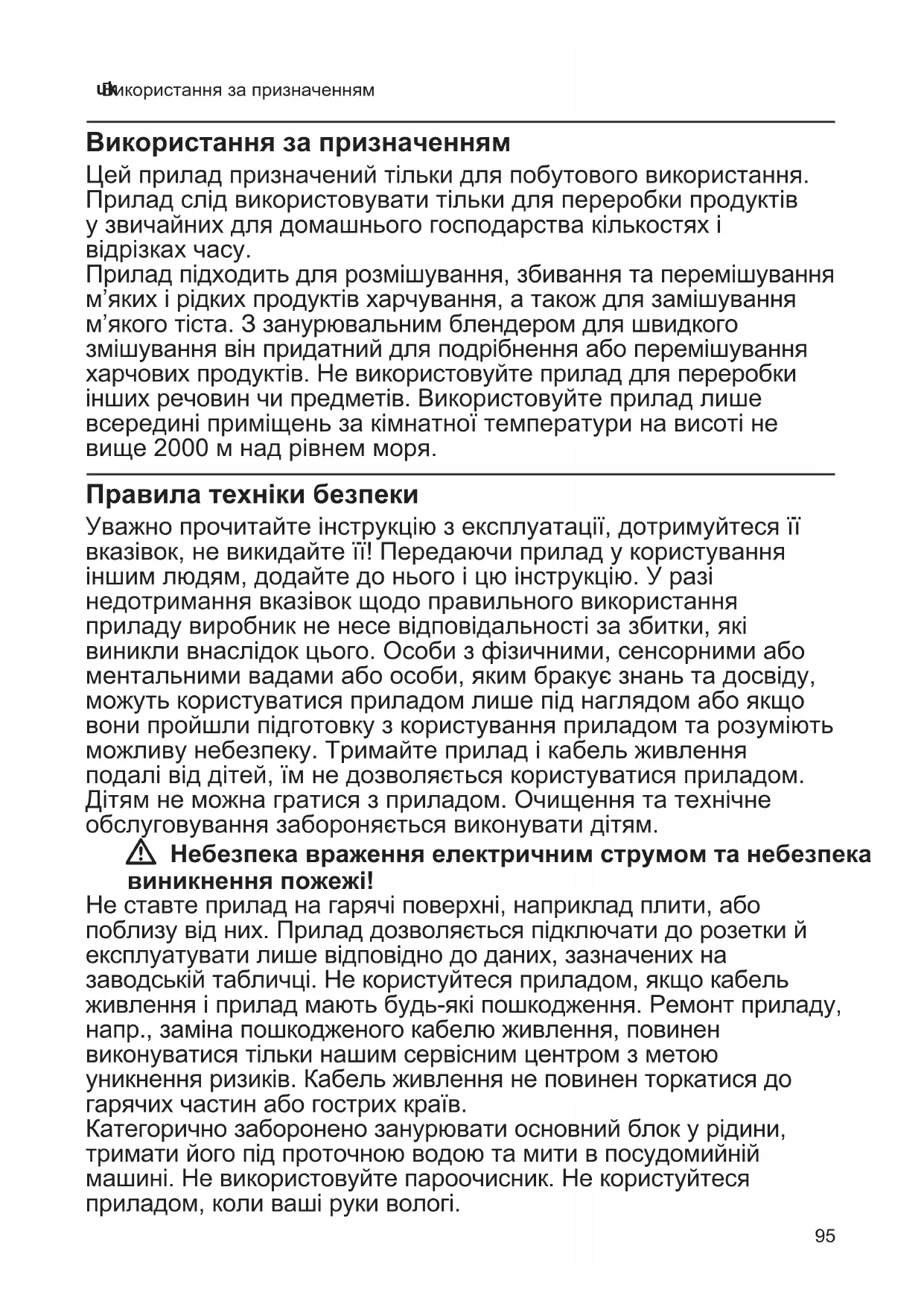 Використання за призначенням Використання за призначенням Цей прилад призначений тільки для побутового використання. Прилад слід використовувати тільки для переробки продуктів у звичайних для домашнього господарства кількостях і відрізках часу. Прилад підходить для розмішування, збивання та перемішування м’яких і рідких продуктів харчування, а також для замішування м’якого тіста. З занурювальним блендером для швидкого змішування він придатний для подрібнення або перемішування харчових продуктів. Не використовуйте прилад для переробки інших речовин чи предметів. Використовуйте прилад лише всередині приміщень за кімнатної температури на висоті не вище 2000 м над рівнем моря. Правила техніки безпеки Уважно прочитайте інструкцію з експлуатації, дотримуйтеся її вказівок, не викидайте її! Передаючи прилад у користування іншим людям, додайте до нього і цю інструкцію. У разі недотримання вказівок щодо правильного використання приладу виробник не несе відповідальності за збитки, які виникли внаслідок цього. Особи з фізичними, сенсорними або ментальними вадами або особи, яким бракує знань та досвіду, можуть користуватися приладом лише під наглядом або якщо вони пройшли підготовку з користування приладом та розуміють можливу небезпеку. Тримайте прилад і кабель живлення подалі від дітей, їм не дозволяється користуватися приладом. Дітям не можна гратися з приладом. Очищення та технічне обслуговування забороняється виконувати дітям. W Небезпека враження електричним струмом та небезпека виникнення пожежі! Не ставте прилад на гарячі поверхні, наприклад плити, або поблизу від них. Прилад дозволяється підключати до розетки й експлуатувати лише відповідно до даних, зазначених на заводській табличці. Не користуйтеся приладом, якщо кабель живлення і прилад мають будьякі пошкодження. Ремонт приладу, напр., заміна пошкодженого кабелю живлення, повинен виконуватися тільки нашим сервісним центром з метою уникнення ризиків. Кабель живлення не повинен торкатися до гарячих частин або гострих країв. Категорично заборонено занурювати основний блок у рідини, тримати його під проточною водою та мити в посудомийній машині. Не використовуйте пароочисник. Не користуйтеся приладом, коли ваші руки вологі.96 uk Правила техніки безпеки Не занурюйте прилад в рідину поверх місця з’єднання занурювального блендера для швидкого змішування з основним