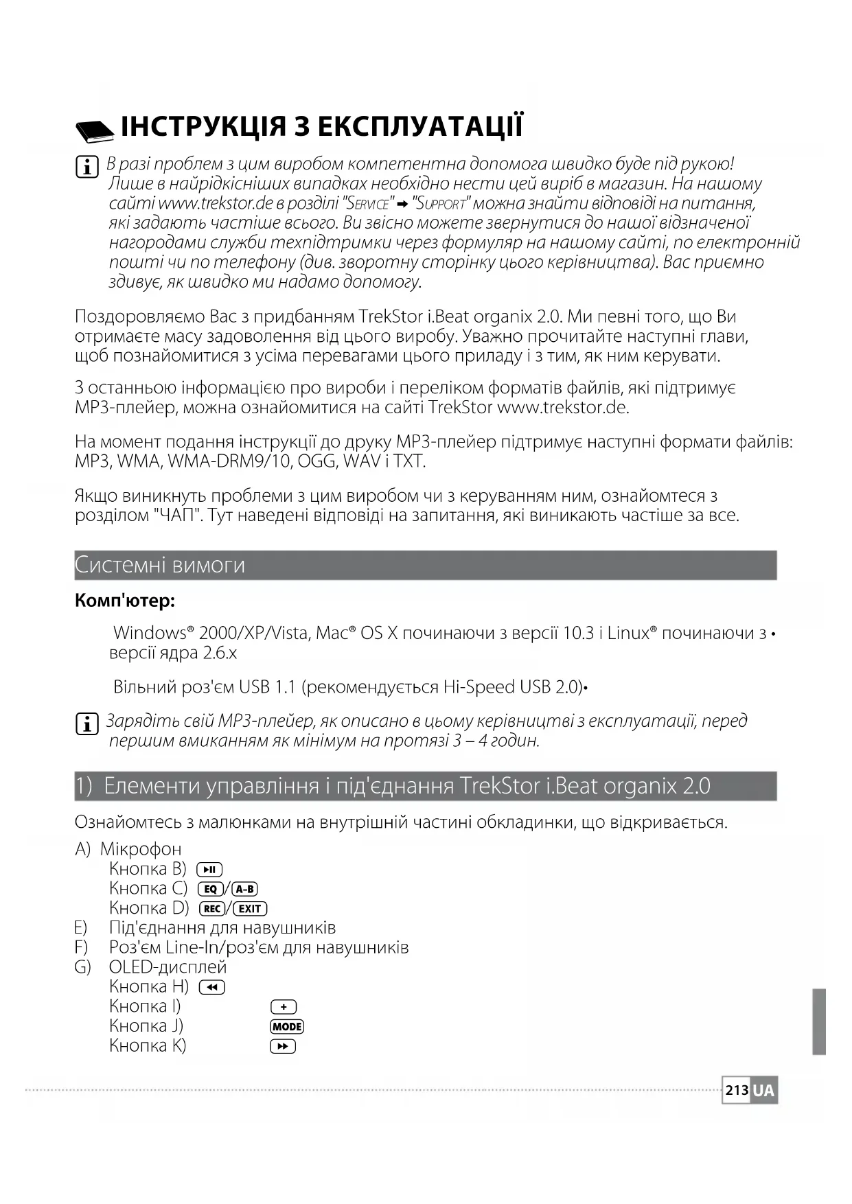 В разі проблем з цим виробом компетентна допомога швидко буде під рукою! Лише в найрідкісніших випадках необхідно нести цей виріб в магазин. На нашому сайті www.trekstor.de в розділі "Se r v i c e " + "Su p p o r t " можна знайти відповіді на питання, які задають частіше всього. Ви звісно можете звернутися до нашої відзначеної нагородами служби техпідтримки через формуляр на нашому сайті, по електронній пошті чи по телефону (див. зворотну сторінку цього керівництва). Вас приємно здивує, як швидко ми надамо допомогу. Поздоровляємо Вас з придбанням TrekStor i.Beat organix 2.0. Ми певні того, що Ви отримаєте масу задоволення від цього виробу. Уважно прочитайте наступні глави, щоб познайомитися з усіма перевагами цього приладу і з тим, як ним керувати. З останньою інформацією про вироби і переліком форматів файлів, які підтримує MP3-плейер, можна ознайомитися на сайті TrekStor www.trekstor.de. На момент подання інструкції до друку MP3-плейер підтримує наступні формати файлів: MP3, WMA, WMA-DRM9/10, OGG, WAV і TXT. Якщо виникнуть проблеми з цим виробом чи з керуванням ним, ознайомтеся з розділом "ЧАП". Тут наведені відповіді на запитання, які виникають частіше за все. Системні вимоги