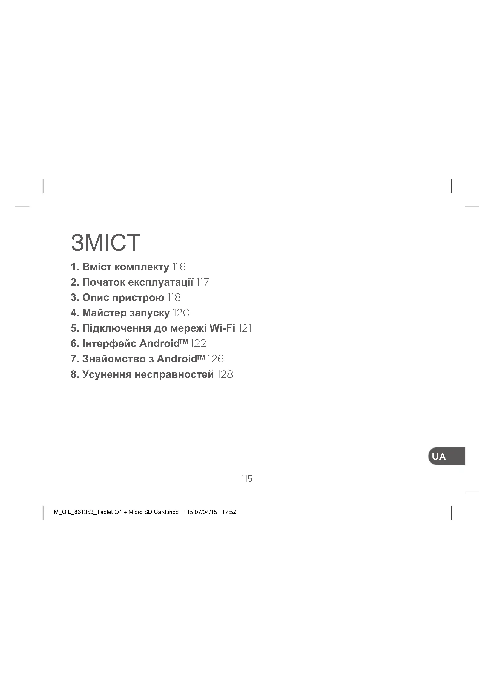 - Прикладні програми сторонніх постачальників РЕКОМЕНДАЦІЇ. Під час настроювання параметрів планшета рекомендовано розмістити пристрій у зоні дії мережі Wi-Fi, яку ви постійно використовуєте. IM_QIL_861353_Tablet Q4 + Micro SD Card.indd 120 07/04/15 17:52120
