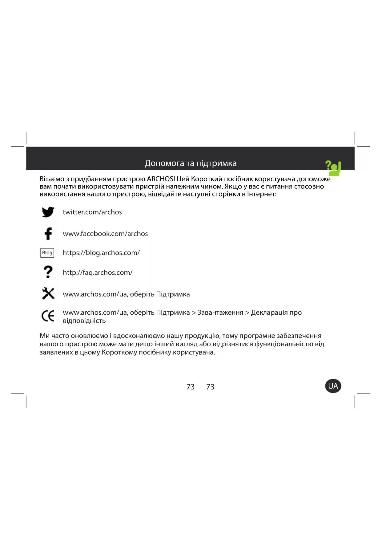 Допомога та підтримка Вітаємо з придбанням пристрою ARCHOS! Цей Короткий посібник користувача допоможе вам почати використовувати пристрій належним чином. Якщо у вас є питання стосовно використання вашого пристрою, відвідайте наступні сторінки в Інтернет: twitter.com/archos www.facebook.com/archos Blog https://blog.archos.com/ http://faq.archos.com/ www.archos.com/ua, оберіть Підтримка www.archos.com/ua, оберіть Підтримка > Завантаження > Декларація про відповідність Ми часто оновлюємо і вдосконалюємо нашу продукцію, тому програмне забезпечення вашого пристрою може мати дещо інший вигляд або відрізнятися функціональністю від заявлених в цьому Короткому посібнику користувача.74 Warranty INPUT: 5V 1.5AModel: AC101AS3GV2MADE IN PRCARCHOS SA. 12 rue Ampère 91430 Igny France Access 101
