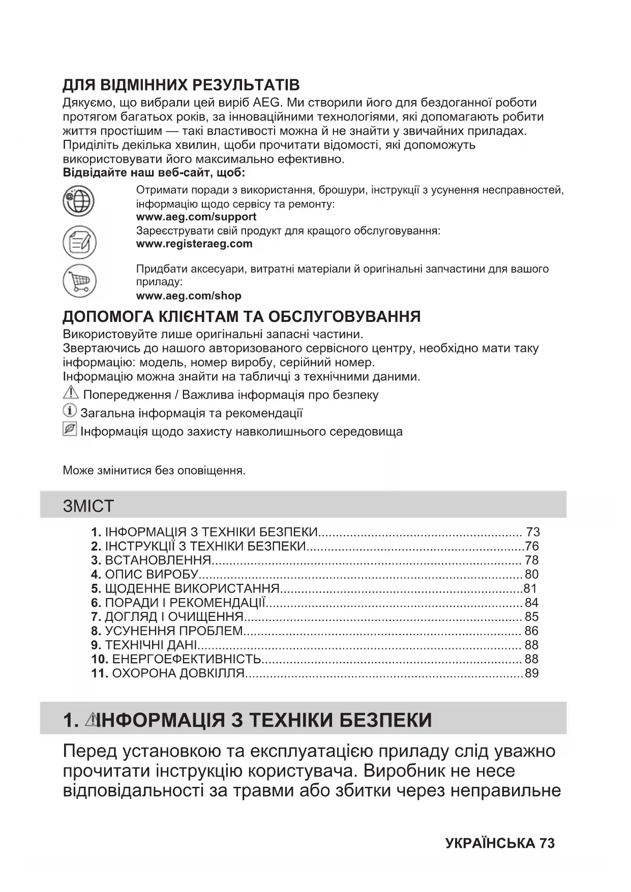 Материалы с символом следует сдавать на переработку. Положите упаковку в соответствующие контейнеры для сбора вторичного сырья. Принимая участие в переработке старого электробытового оборудования, Вы помогаете защитить окружающую среду и здоровье человека. Не выбрасывайте вместе с бытовыми отходами бытовую технику, помеченную символом . Прибор следует доставить в место раздельного накопления и сбора отходов потребления или в пункт сбора использованной бытовой техники для последующей утилизации. 72 РУССКИЙДЛЯ ВІДМІННИХ РЕЗУЛЬТАТІВ Дякуємо, що вибрали цей виріб AEG. Ми створили його для бездоганної роботипротягом багатьох років, за інноваційними технологіями, які допомагають робитижиття простішим — такі властивості можна й не знайти у звичайних приладах.Приділіть декілька хвилин, щоби прочитати відомості, які допоможутьвикористовувати його максимально ефективно.Відвідайте наш веб-сайт, щоб:Отримати поради з використання, брошури, інструкції з усунення несправностей,інформацію щодо сервісу та ремонту:www.aeg.com/supportЗареєструвати свій продукт для кращого обслуговування:www.registeraeg.comПридбати аксесуари, витратні матеріали й оригінальні запчастини для вашогоприладу:www.aeg.com/shop ДОПОМОГА КЛІЄНТАМ ТА ОБСЛУГОВУВАННЯ Використовуйте лише оригінальні запасні частини.Звертаючись до нашого авторизованого сервісного центру, необхідно мати такуінформацію: модель, номер виробу, серійний номер.Інформацію можна знайти на табличці з технічними даними. Попередження / Важлива інформація про безпеку Загальна інформація та рекомендації Інформація щодо захисту навколишнього середовищаМоже змінитися без оповіщення. 1. ІНФОРМАЦІЯ З ТЕХНІКИ БЕЗПЕКИ.......................................................... 732. ІНСТРУКЦІЇ З ТЕХНІКИ БЕЗПЕКИ..............................................................76
