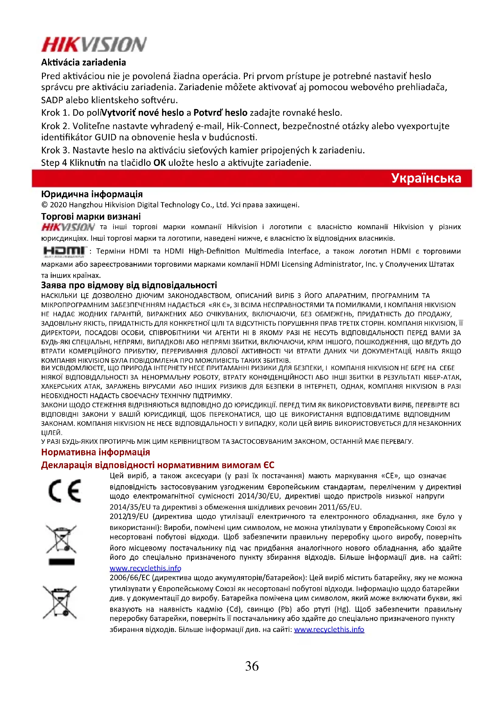 Юридична інформація © 2020 Hangzhou Hikvision Digital Technology Co., Ltd. Усі права захищені. Торгові марки визнані та інші торгові марки компанії Hikvision і логотипи є власністю компанії Hikvision у різних юрисдикціях. Інші торгові марки та логотипи, наведені нижче, є власністю їх відповідних власників. : Терміни HDMI та HDMI High-Definition Multimedia Interface, а також логотип HDMI є торговими марками або зареєстрованими торговими марками компанії HDMI Licensing Administrator, Inc. у Сполучених Штатах та інших країнах. Заява про відмову від відповідальності НАСКІЛЬКИ ЦЕ ДОЗВОЛЕНО ДІЮЧИМ ЗАКОНОДАВСТВОМ, ОПИСАНИЙ ВИРІБ З ЙОГО АПАРАТНИМ, ПРОГРАМНИМ ТА МІКРОПРОГРАМНИМ ЗАБЕЗПЕЧЕННЯМ НАДАЄТЬСЯ «ЯК Є», ЗІ ВСІМА НЕСПРАВНОСТЯМИ ТА ПОМИЛКАМИ, І КОМПАНІЯ HIKVISION НЕ НАДАЄ ЖОДНИХ ГАРАНТІЙ, ВИРАЖЕНИХ АБО ОЧІКУВАНИХ, ВКЛЮЧАЮЧИ, БЕЗ ОБМЕЖЕНЬ, ПРИДАТНІСТЬ ДО ПРОДАЖУ, ЗАДОВІЛЬНУ ЯКІСТЬ, ПРИДАТНІСТЬ ДЛЯ КОНКРЕТНОЇ ЦІЛІ ТА ВІДСУТНІСТЬ ПОРУШЕННЯ ПРАВ ТРЕТІХ СТОРІН. КОМПАНІЯ HIKVISION, ЇЇ ДИРЕКТОРИ, ПОСАДОВІ ОСОБИ, СПІВРОБІТНИКИ ЧИ АГЕНТИ НІ В ЯКОМУ РАЗІ НЕ НЕСУТЬ ВІДПОВІДАЛЬНОСТІ ПЕРЕД ВАМИ ЗА БУДЬ-ЯКІ СПЕЦІАЛЬНІ, НЕПРЯМІ, ВИПАДКОВІ АБО НЕПРЯМІ ЗБИТКИ, ВКЛЮЧАЮЧИ, КРІМ ІНШОГО, ПОШКОДЖЕННЯ, ЩО ВЕДУТЬ ДО ВТРАТИ КОМЕРЦІЙНОГО ПРИБУТКУ, ПЕРЕРИВАННЯ ДІЛОВОЇ АКТИВНОСТІ ЧИ ВТРАТИ ДАНИХ ЧИ ДОКУМЕНТАЦІЇ, НАВІТЬ ЯКЩО КОМПАНІЯ HIKVISION БУЛА ПОВІДОМЛЕНА ПРО МОЖЛИВІСТЬ ТАКИХ ЗБИТКІВ. ВИ УСВІДОМЛЮЄТЕ, ЩО ПРИРОДА ІНТЕРНЕТУ НЕСЕ ПРИТАМАННІ РИЗИКИ ДЛЯ БЕЗПЕКИ, І КОМПАНІЯ HIKVISION НЕ БЕРЕ НА СЕБЕ НІЯКОЇ ВІДПОВІДАЛЬНОСТІ ЗА НЕНОРМАЛЬНУ РОБОТУ, ВТРАТУ КОНФІДЕНЦІЙНОСТІ АБО ІНШІ ЗБИТКИ В РЕЗУЛЬТАТІ КІБЕР-АТАК, ХАКЕРСЬКИХ АТАК, ЗАРАЖЕНЬ ВІРУСАМИ АБО ІНШИХ РИЗИКІВ ДЛЯ БЕЗПЕКИ В ІНТЕРНЕТІ, ОДНАК, КОМПАНІЯ HIKVISION В РАЗІ НЕОБХІДНОСТІ НАДАСТЬ СВОЄЧАСНУ ТЕХНІЧНУ ПІДТРИМКУ. ЗАКОНИ ЩОДО СТЕЖЕННЯ ВІДРІЗНЯЮТЬСЯ ВІДПОВІДНО ДО ЮРИСДИКЦІЇ. ПЕРЕД ТИМ ЯК ВИКОРИСТОВУВАТИ ВИРІБ, ПЕРЕВІРТЕ ВСІ ВІДПОВІДНІ ЗАКОНИ У ВАШІЙ ЮРИСДИКЦІЇ, ЩОБ ПЕРЕКОНАТИСЯ, ЩО ЦЕ ВИКОРИСТАННЯ ВІДПОВІДАТИМЕ ВІДПОВІДНИМ ЗАКОНАМ. КОМПАНІЯ HIKVISION НЕ НЕСЕ ВІДПОВІДАЛЬНОСТІ У ВИПАДКУ, КОЛИ ЦЕЙ ВИРІБ ВИКОРИСТОВУЄТЬСЯ ДЛЯ НЕЗАКОННИХ У РАЗІ БУДЬ-ЯКИХ ПРОТИРІЧЬ МІЖ ЦИМ КЕРІВНИЦТВОМ ТА ЗАСТОСОВУВАНИМ ЗАКОНОМ, ОСТАННІЙ МАЄ ПЕРЕВАГУ. Нормативна інформація Декларація відповідності нормативним вимогам ЄС