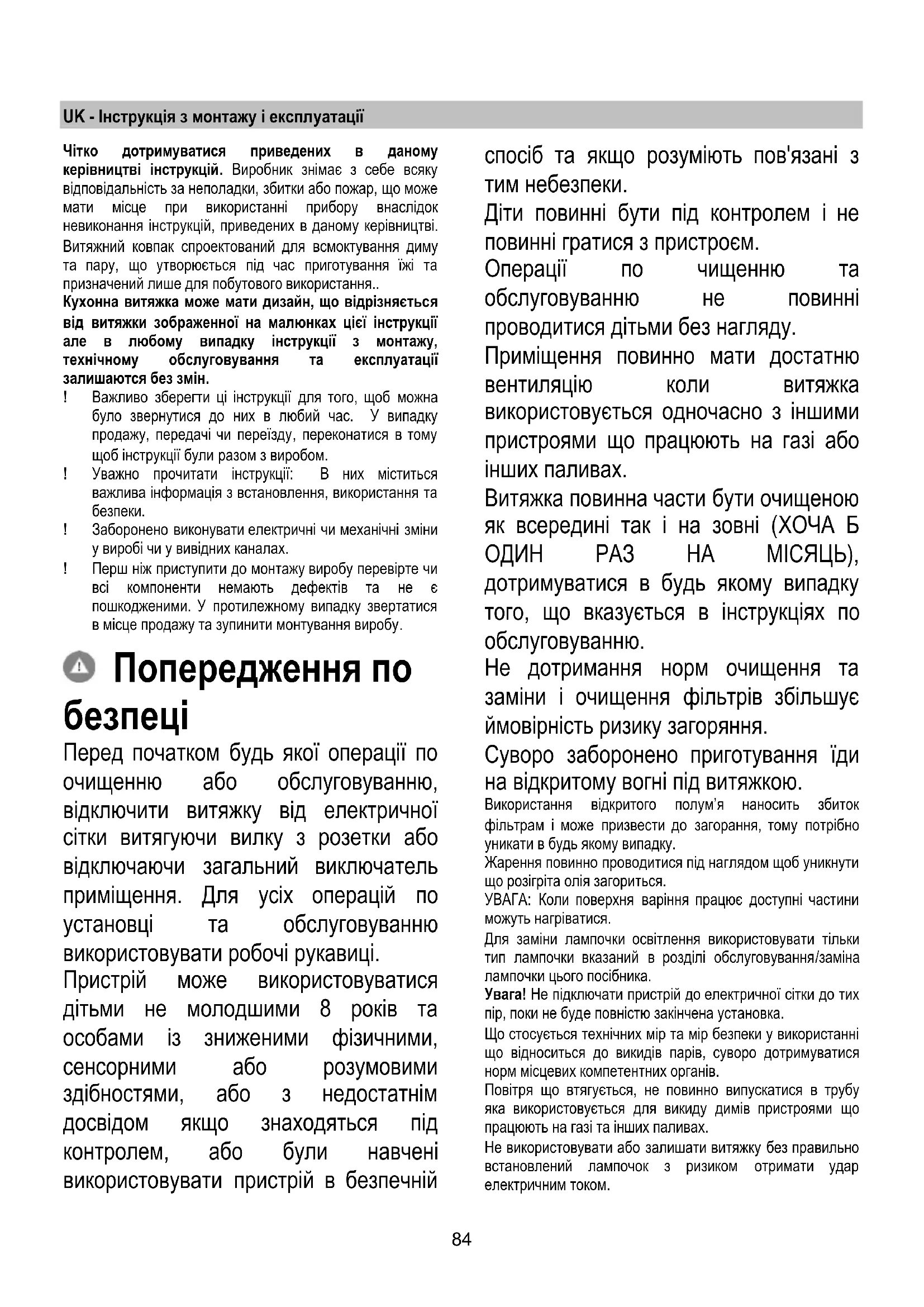 Перед початком будь якої операції по очищенню або обслуговуванню, відключити витяжку від електричної сітки витягуючи вилку з розетки або відключаючи загальний виключатель приміщення. Для усіх операцій по установці та обслуговуванню використовувати робочі рукавиці. Пристрій може використовуватися дітьми не молодшими 8 років та особами із зниженими фізичними, сенсорними або розумовими здібностями, або з недостатнім досвідом якщо знаходяться під контролем, або були навчені використовувати пристрій в безпечній спосіб та якщо розуміють пов'язані з тим небезпеки. Діти повинні бути під контролем і не повинні гратися з пристроєм. Операції по чищенню та обслуговуванню не повинні проводитися дітьми без нагляду. Приміщення повинно мати достатню вентиляцію коли витяжка використовується одночасно з іншими пристроями що працюють на газі або інших паливах. Витяжка повинна части бути очищеною як всередині так і на зовні (ХОЧА Б ОДИН РАЗ НА МІСЯЦЬ), дотримуватися в будь якому випадку того, що вказується в інструкціях по обслуговуванню. Не дотримання норм очищення та заміни і очищення фільтрів збільшує ймовірність ризику загоряння. Суворо заборонено приготування їди на відкритому вогні під витяжкою. Використання відкритого полум’я наносить збиток фільтрам і може призвести до загорання, тому потрібно уникати в будь якому випадку. Жарення повинно проводитися під наглядом щоб уникнути що розігріта олія загориться. УВАГА: Коли поверхня варіння працює доступні частини можуть нагріватися. Для заміни лампочки освітлення використовувати тільки тип лампочки вказаний в розділі обслуговування