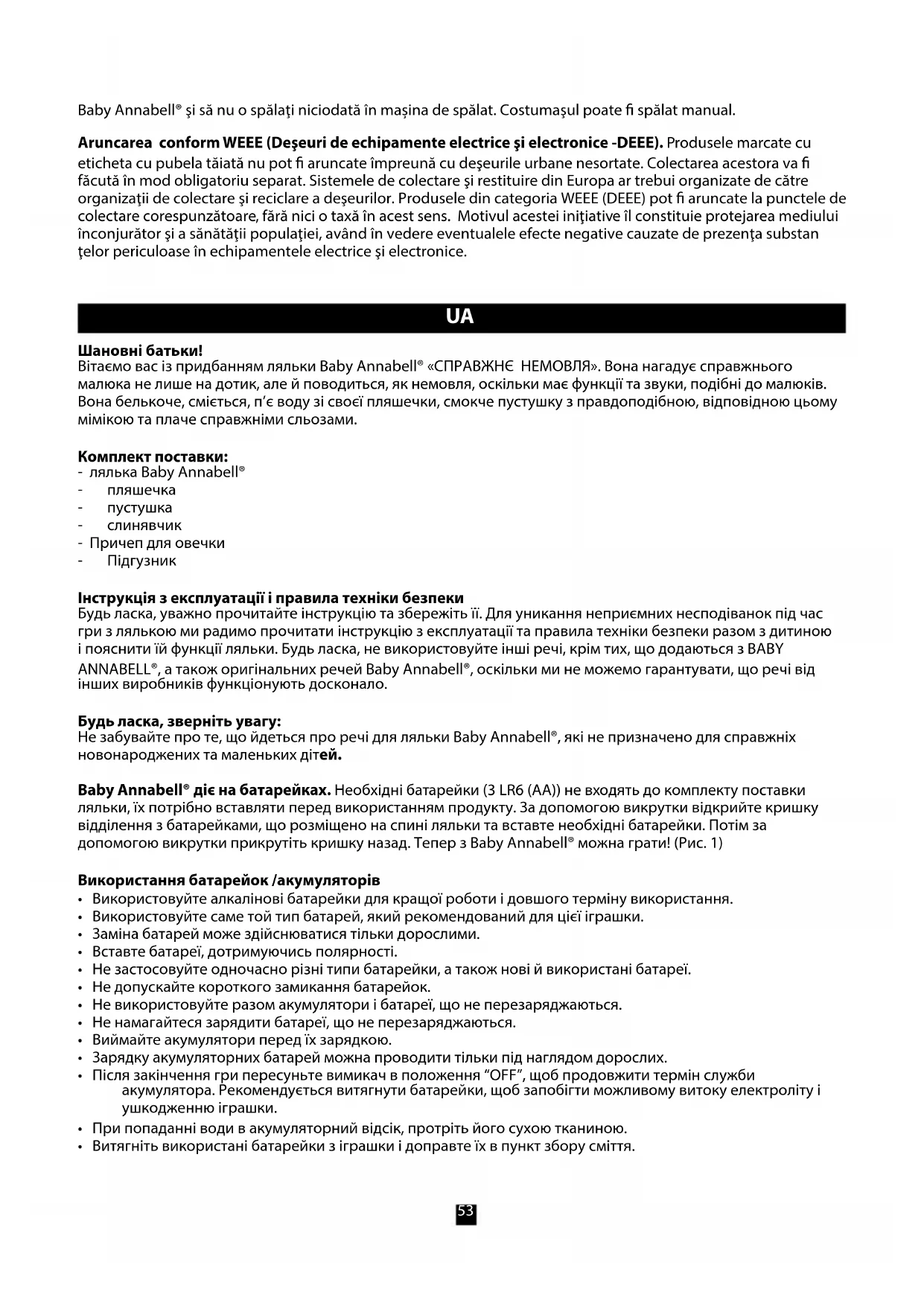 - слинявчик - Причеп для овечки - Підгузник Інструкція з експлуатації і правила техніки безпеки Будь ласка, уважно прочитайте інструкцію та збережіть її. Для уникання неприємних несподіванок під час гри з лялькою ми радимо прочитати інструкцію з експлуатації та правила техніки безпеки разом з дитиною і пояснити їй функції ляльки. Будь ласка, не використовуйте інші речі, крім тих, що додаються з BABY ANNABELL®,атакожоригінальнихречейBabyAnnabell®,оскількиминеможемогарантувати,щоречівід інших виробників функціонують досконало. Будь ласка, зверніть увагу: Не забувайте про те, що йдеться про речі для ляльки Baby Annabell®, які не призначено для справжніх новонароджених та маленьких дітей. Baby Annabell® діє на батарейках. Необхідні батарейки (3 LR6 (AA)) не входять до комплекту поставки ляльки, їх потрібно вставляти перед використанням продукту. За допомогою викрутки відкрийте кришку відділення з батарейками, що розміщено на спині ляльки та вставте необхідні батарейки. Потім за допомогою викрутки прикрутіть кришку назад. Тепер з Baby Annabell® можна грати! (Рис. 1) Використання батарейок /акумуляторів