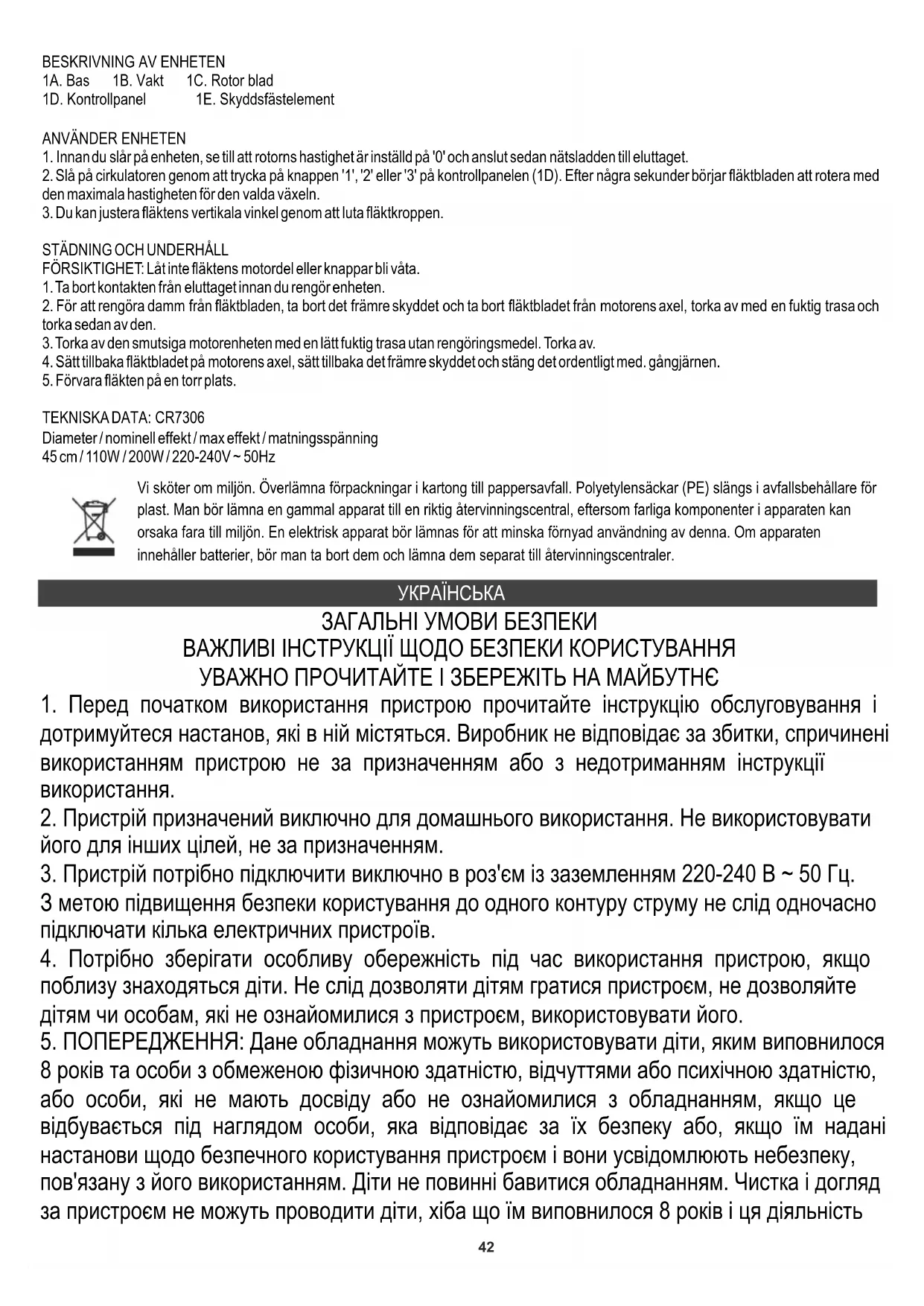 ТЕХНІЧНІ ДАНІ: CR7306 Діаметр / Номінальна потужність / Максимальна потужність / Напруга живлення 45 см / 110 Вт / 200 Вт / 220-240 В ~ 50 Гц