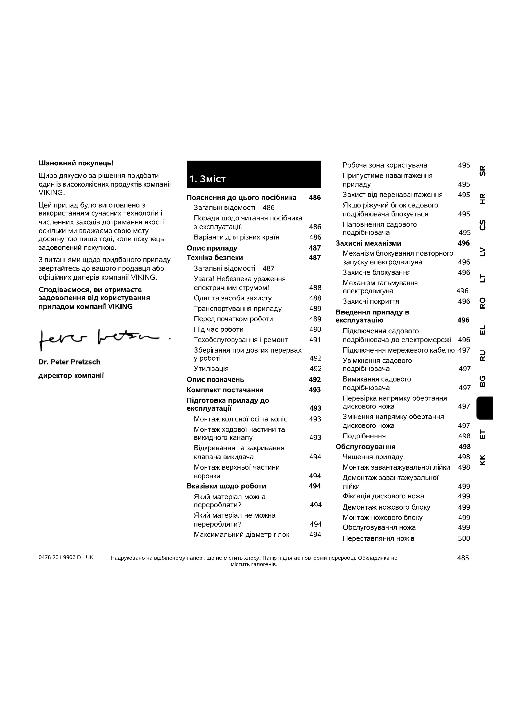 Пояснення до цього посібника 486 Загальні відомості 486 Поради щодо читання посібника з експлуатації.486 Варіанти для різних країн 486 Опис приладу 487 Техніка безпеки 487 Загальні відомості 487 Увага! Небезпека ураження електричним струмом!488 Одяг та засоби захисту 488 Транспортування приладу 489 Перед початком роботи 489 Під час роботи 490 Техобслуговування і ремонт 491 Зберігання при довгих перервах у роботі 492 Утилізація 492 Опис позначень 492 Комплект постачання 493 Підготовка приладу до експлуатації 493 Монтаж колісної осі та коліс 493 Монтаж ходової частини та викидного каналу 493 Відкривання та закривання клапана викидача 494 Монтаж верхньої частини воронки 494 Вказівки щодо роботи 494 Який матеріал можна переробляти?494 Який матеріал не можна переробляти?494 Максимальний діаметр гілок 494 Робоча зона користувача 495 Припустиме навантаження приладу 495 Захист від перенавантаження 495 Якщо ріжучий блок садового подрібнювача блокується 495 Наповнення садового подрібнювача 495 Захисні механізми 496 Механізм блокування повторного запуску електродвигуна 496 Захисне блокування 496 Механізм гальмування електродвигуна 496 Захисні покриття 496 Введення приладу в експлуатацію 496 Підключення садового подрібнювача до електромережі 496 Підключення мережевого кабелю 497 Увімкнення садового подрібнювача 497 Вимикання садового подрібнювача 497 Перевірка напрямку обертання дискового ножа 497 Змінення напрямку обертання дискового ножа 497 Подрібнення 498 Обслуговування 498 Чищення приладу 498 Монтаж завантажувальної лійки 498 Демонтаж завантажувальної лійки 499 Фіксація дискового ножа 499 Демонтаж ножового блоку 499 Монтаж ножового блоку 499 Обслуговування ножа 499 Переставляння ножів 5000478 201 9906 D - UK