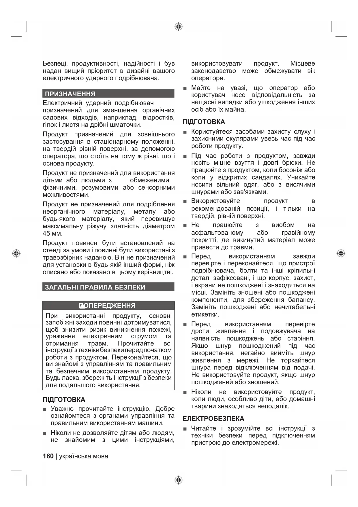 Без предупредителен символ за безопасност Указва ситуация, която може да доведе до имуществени щети.160 | українська мова Безпеці, продуктивності, надійності і був надан вищий пріоритет в дизайні вашого електричного ударного подрібнювача. ПРИЗНАЧЕННЯ Електричний ударний подрібнювач призначений для зменшення органічних садових відходів, наприклад, відростків, гілок і листя на дрібні шматочки. Продукт призначений для зовнішнього застосування в стаціонарному положенні, на твердій рівній поверхні, за допомогою оператора, що стоїть на тому ж рівні, що і основа продукту. Продукт не призначений для використання дітьми або людьми з