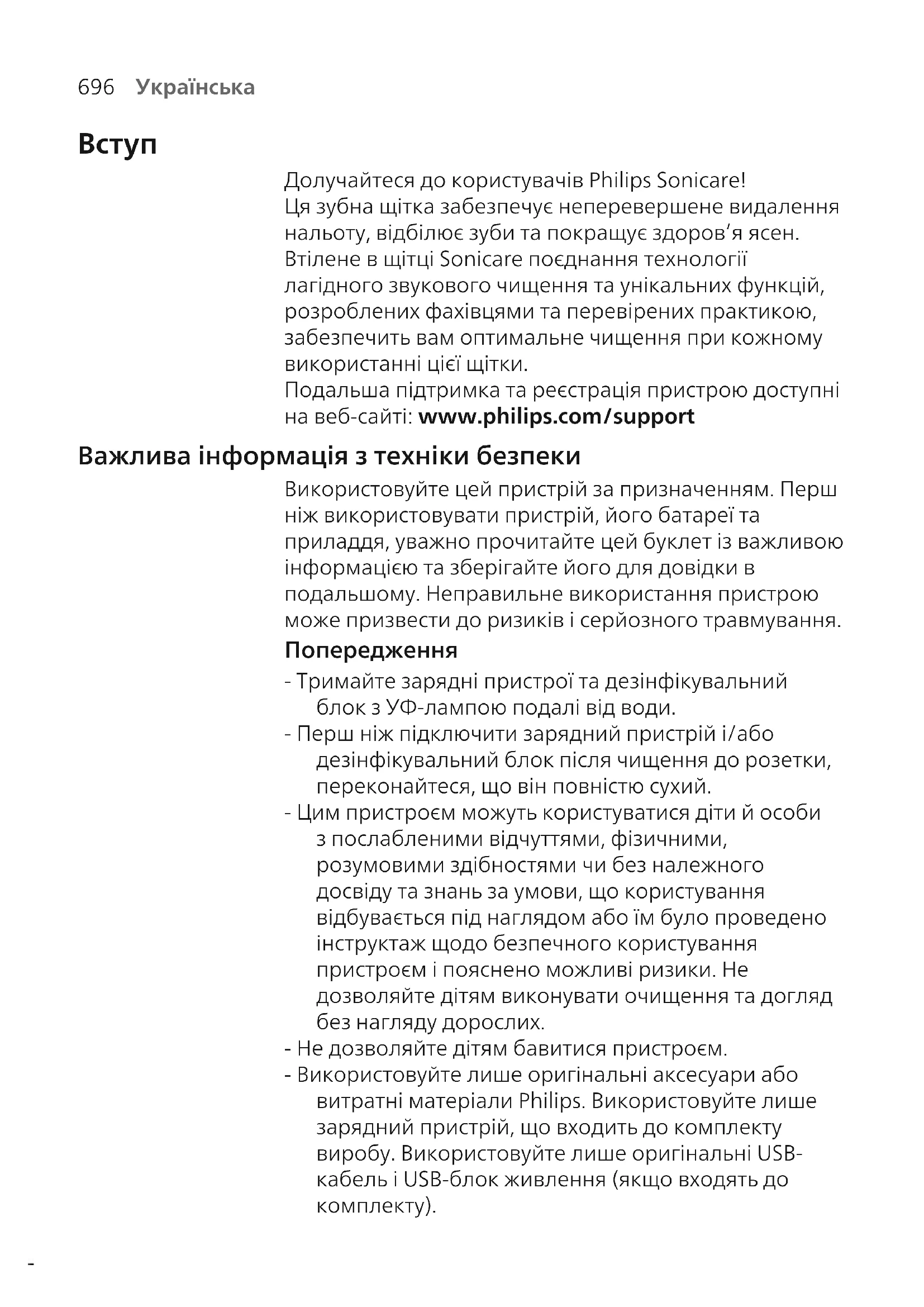 Долучайтеся до користувачів Philips Sonicare! Ця зубна щітка забезпечує неперевершене видалення нальоту, відбілює зуби та покращує здоров’я ясен. Втілене в щітці Sonicare поєднання технології лагідного звукового чищення та унікальних функцій, розроблених фахівцями та перевірених практикою, забезпечить вам оптимальне чищення при кожному використанні цієї щітки. Подальша підтримка та реєстрація пристрою доступні на веб-сайті: www.philips.com/support Важлива інформація з техніки безпеки Використовуйте цей пристрій за призначенням. Перш ніж використовувати пристрій, його батареї та приладдя, уважно прочитайте цей буклет із важливою інформацією та зберігайте його для довідки в подальшому. Неправильне використання пристрою може призвести до ризиків і серйозного травмування. Попередження - Тримайте зарядні пристрої та дезінфікувальний блок з УФ-лампою подалі від води. - Перш ніж підключити зарядний пристрій і/або дезінфікувальний блок після чищення до розетки, переконайтеся, що він повністю сухий. - Цим пристроєм можуть користуватися діти й особи з послабленими відчуттями, фізичними, розумовими здібностями чи без належного досвіду та знань за умови, що користування відбувається під наглядом або їм було проведено інструктаж щодо безпечного користування пристроєм і пояснено можливі ризики. Не дозволяйте дітям виконувати очищення та догляд без нагляду дорослих. - Не дозволяйте дітям бавитися пристроєм. - Використовуйте лише оригінальні аксесуари або витратні матеріали Philips. Використовуйте лише зарядний пристрій, що входить до комплекту виробу. Використовуйте лише оригінальні USB- кабель і USB-блок живлення (якщо входять до комплекту).697