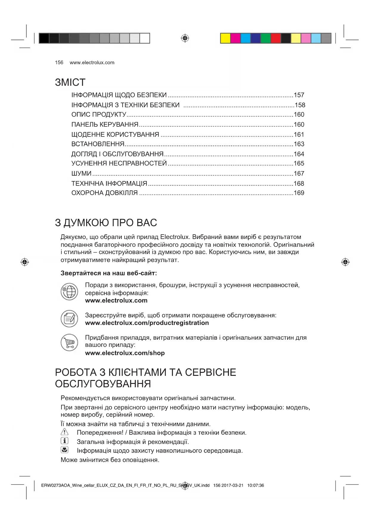 - Якщо електричний провід пошкоджений, він має бути замінений виробником, представником сервісного центру чи призначеною ними особою. Робити це самостійно небезпечно. ERW0273AOA_Wine_cellar_ELUX_CZ_DA_EN_FI_FR_IT_NO_PL_RU_SK_SV_UK.indd 158 2017-03-21 10:07:36159