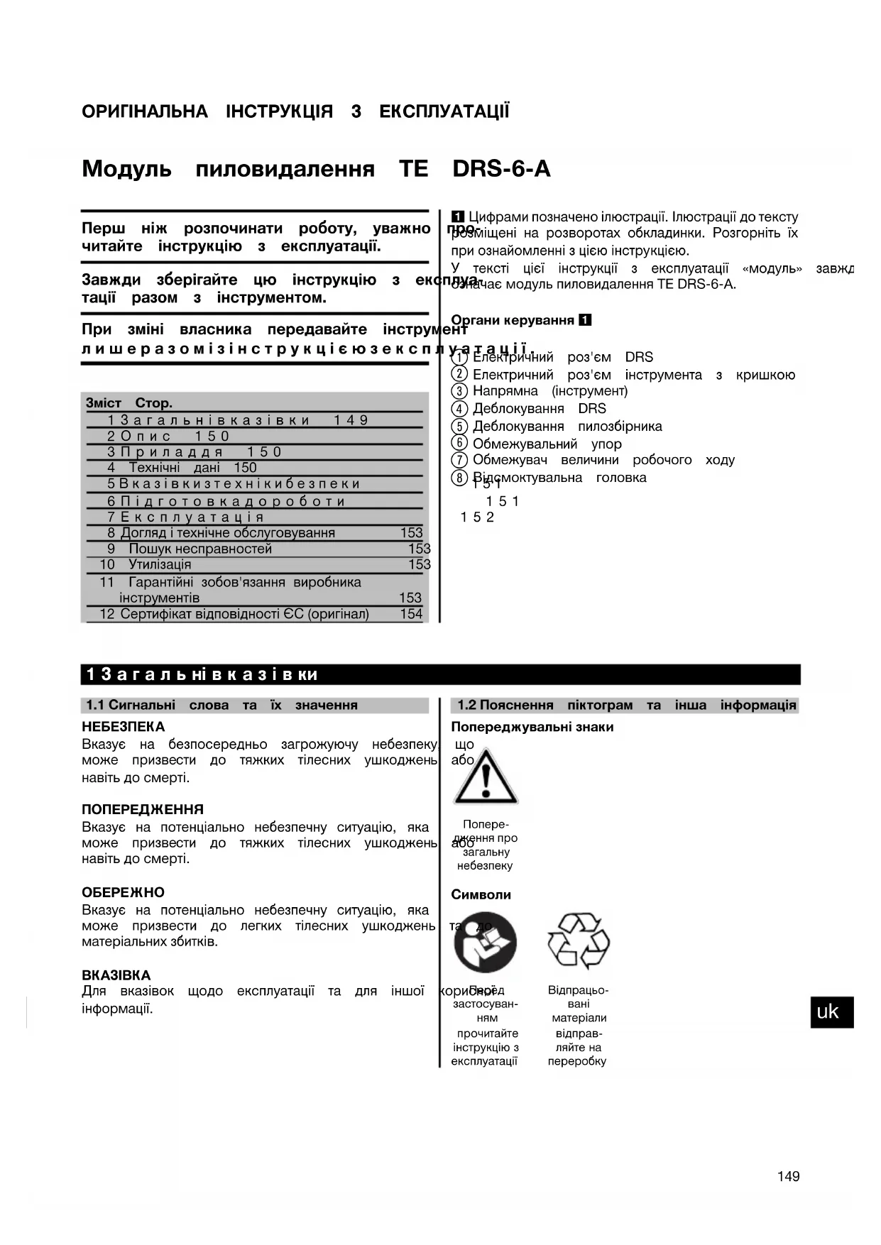 Printed: 08.07.2013 | Doc-Nr: PUB / 5071244 / 000 / 02ОРИГІНАЛЬНА ІНСТРУКЦІЯ З ЕКСПЛУАТАЦІЇ Модуль пиловидалення TE DRS‑6‑A Перш ніж розпочинати роботу, уважно про- читайте інструкцію з експлуатації. Завжди зберігайте цю інструкцію з експлуа- тації разом з інструментом. При зміні власника передавайте інструмент лишеразомізінструкцієюзексплуатації. Зміст Стор.1Загальнівказівки 1492Опис 1503Приладдя 1504 Технічні дані 1505Вказівкизтехнікибезпеки 1516Підготовкадороботи 1517Експлуатація 152 8 Догляд і технічне обслуговування 153 9 Пошук несправностей 15310 Утилізація 15311 Гарантійні зобов'язання виробникаінструментів 153 12 Сертифікат відповідності ЄС (оригінал) 154 1 Цифрами позначено ілюстрації. Ілюстрації до тексту розміщені на розворотах обкладинки. Розгорніть їх при ознайомленні з цією інструкцією. У тексті цієї інструкції з експлуатації «модуль» завжди означає модуль пиловидалення TE DRS‑6‑A. Органи керування 1 Електричний роз'єм DRS Електричний роз'єм інструмента з кришкою Напрямна (інструмент) Деблокування DRS Деблокування пилозбірника Обмежувальний упор Обмежувач величини робочого ходу Відсмоктувальна головка 1Загальнівказівки 1.1 Сигнальні слова та їх значенняНЕБЕЗПЕКАВказує на безпосередньо загрожуючу небезпеку, щоможе призвести до тяжких тілесних ушкоджень абонавіть до смерті.ПОПЕРЕДЖЕННЯ Вказує на потенціально небезпечну ситуацію, яка може призвести до тяжких тілесних ушкоджень абонавіть до смерті.ОБЕРЕЖНО Вказує на потенціально небезпечну ситуацію, яка може призвести до легких тілесних ушкоджень та доматеріальних збитків.ВКАЗІВКАДля вказівок щодо експлуатації та для іншої корисноїінформації.1.2 Пояснення піктограм та інша інформаціяПопереджувальні знакиПопере-дження прозагальнунебезпекуСимволиПередзастосуван- прочитайтеінструкцію зексплуатаціїВідпрацьо- матеріаливідправ-ляйте напереробку