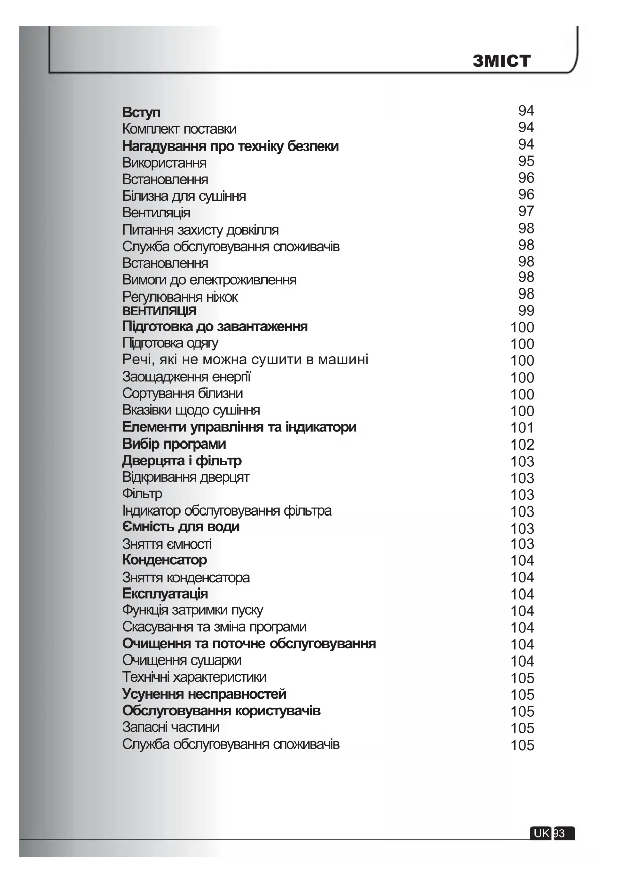 Індикатор обслуговування фільтра Ємність для води Зняття ємності Конденсатор Зняття конденсатора Експлуатація Функція затримки пуску Скасування та зміна програми Очищення та поточне обслуговування Очищення сушарки Технічні характеристики Усунення несправностей Обслуговування користувачів Запасні частини Служба обслуговування споживачівВСТУП Будь ласка, перевірте наявність наступних позицій, зазначених нижче, які надаються разом з приладом: