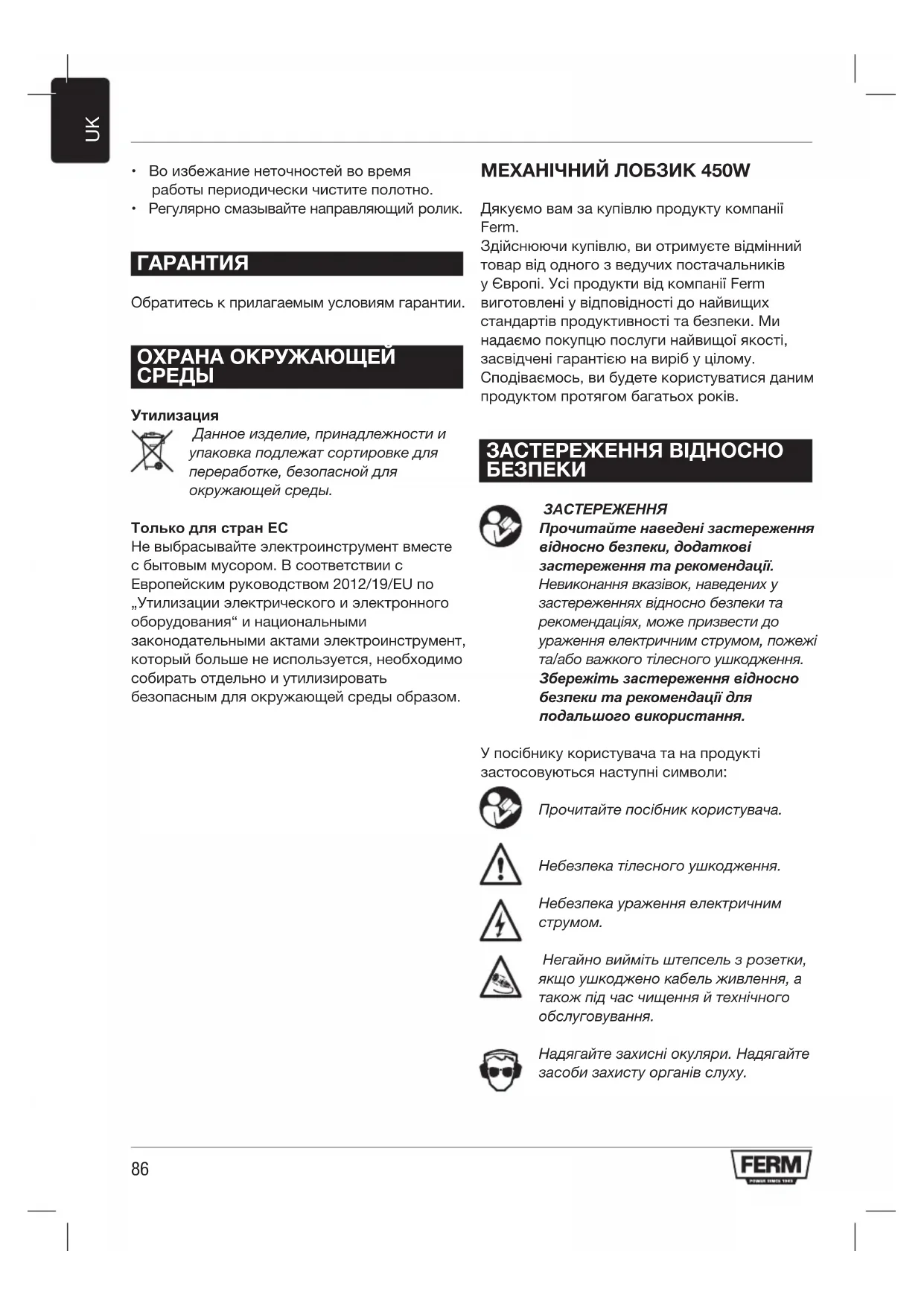 Данное изделие, принадлежности и упаковка подлежат сортировке для переработке, безопасной для окружающей среды. Только для стран ЕС Не выбрасывайте электроинструмент вместе с бытовым мусором. В соответствии с Европейским руководством 2012/19/ЕU по „Утилизации электрического и электронного оборудования“ и национальными законодательными актами электроинструмент, который больше не используется, необходимо собирать отдельно и утилизировать безопасным для окружающей среды образом. МЕХАНІЧНИЙ ЛОБЗИК 450W Дякуємо вам за купівлю продукту компанії Ferm. Здійснюючи купівлю, ви отримуєте відмінний товар від одного з ведучих постачальників у Європі. Усі продукти від компанії Ferm виготовлені у відповідності до найвищих стандартів продуктивності та безпеки. Ми надаємо покупцю послуги найвищої якості, засвідчені гарантією на виріб у цілому. Сподіваємось, ви будете користуватися даним продуктом протягом багатьох років. ЗАСТЕРЕЖЕННЯ ВІДНОСНО