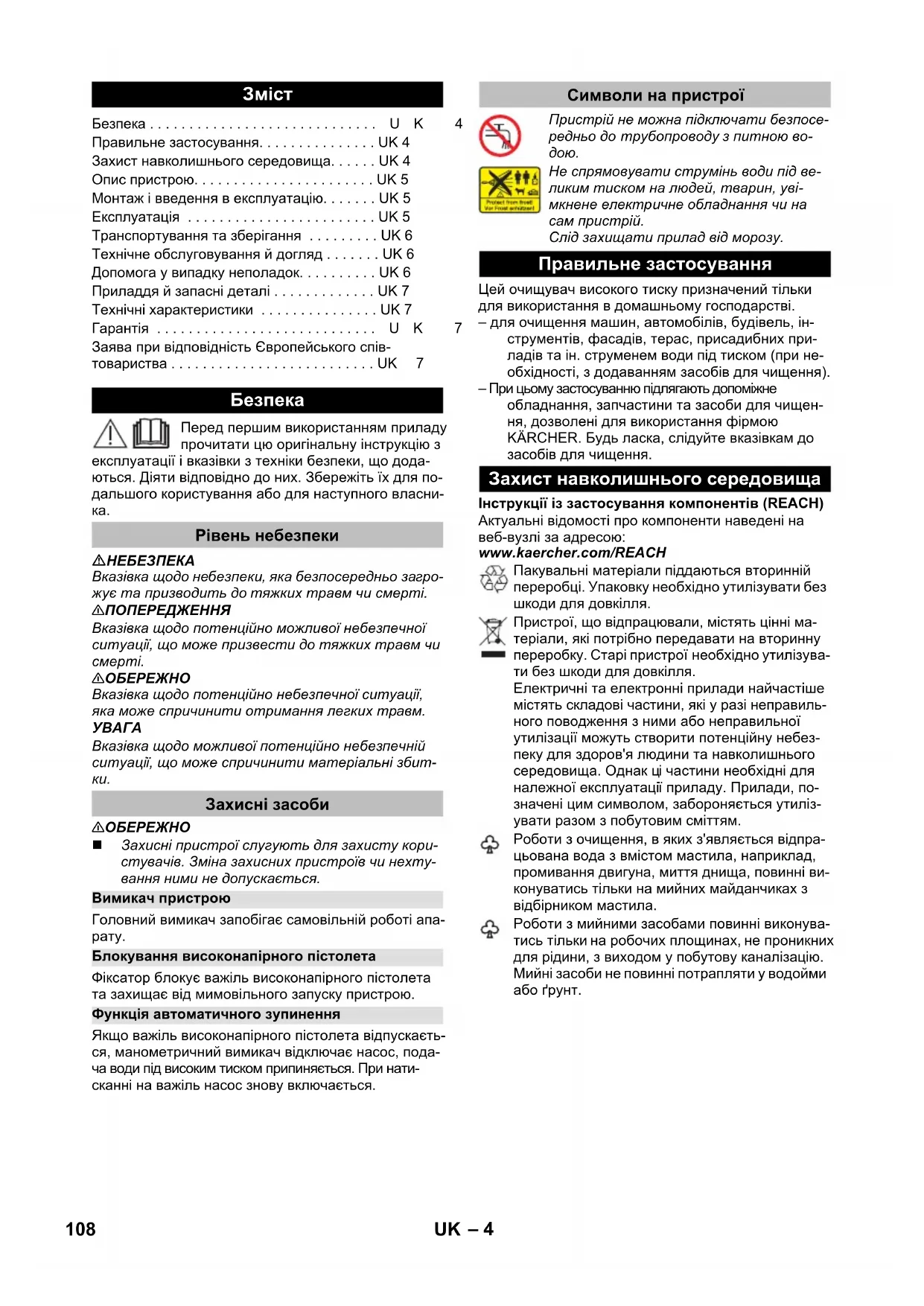Фіксатор блокує важіль високонапірного пістолета та захищає від мимовільного запуску пристрою. Якщо важіль високонапірного пістолета відпускаєть- ся, манометричний вимикач відключає насос, пода- ча води під високим тиском припиняється. При нати- сканні на важіль насос знову включається. Цей очищувач високого тиску призначений тільки для використання в домашньому господарстві. – для очищення машин, автомобілів, будівель, ін- струментів, фасадів, терас, присадибних при- ладів та ін. струменем води під тиском (при не- обхідності, з додаванням засобів для чищення). – При цьому застосуванню підлягають допоміжне обладнання, запчастини та засоби для чищен- ня, дозволені для використання фірмою KÄRCHER. Будь ласка, слідуйте вказівкам до засобів для чищення. Інструкції із застосування компонентів (REACH) Актуальні відомості про компоненти наведені на веб-вузлі за адресою: www.kaercher.com/REACH