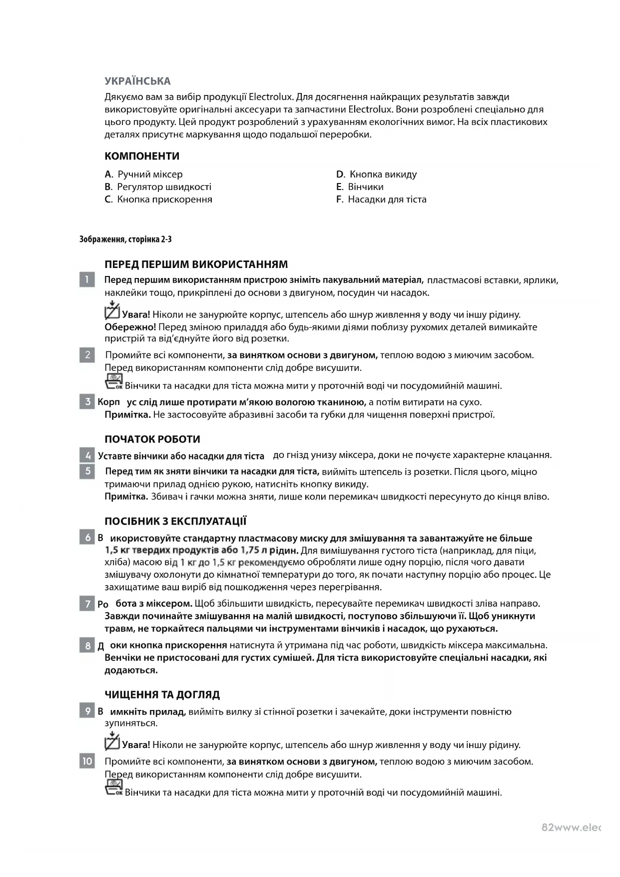 A. Ручний міксер B. Регулятор швидкості C. Кнопка прискорення D. Кнопка викиду E. Вінчики F. Насадки для тіста Зображення, сторінка 2-3 ПЕРЕД ПЕРШИМ ВИКОРИСТАННЯМ 1 Перед першим використанням пристрою зніміть пакувальний матеріал, пластмасові вставки, ярлики, наклейки тощо, прикріплені до основи з двигуном, посудин чи насадок. Увага! Ніколи не занурюйте корпус, штепсель або шнур живлення у воду чи іншу рідину. Обережно! Перед зміною приладдя або будь-якими діями поблизу рухомих деталей вимикайте пристрій та від’єднуйте його від розетки. 2 Промийте всі компоненти, за винятком основи з двигуном, теплою водою з миючим засобом. Перед використанням компоненти слід добре висушити. Вінчики та насадки для тіста можна мити у проточній воді чи посудомийній машині. 3 Корп ус слід лише протирати м’якою вологою тканиною, а потім витирати на сухо. Примітка. Не застосовуйте абразивні засоби та губки для чищення поверхні пристрої. ПОЧАТОК РОБОТИ 4 Уставте вінчики або насадки для тіста до гнізд унизу міксера, доки не почуєте характерне клацання. 5 Перед тим як зняти вінчики та насадки для тіста, вийміть штепсель із розетки. Після цього, міцно тримаючи прилад однією рукою, натисніть кнопку викиду.