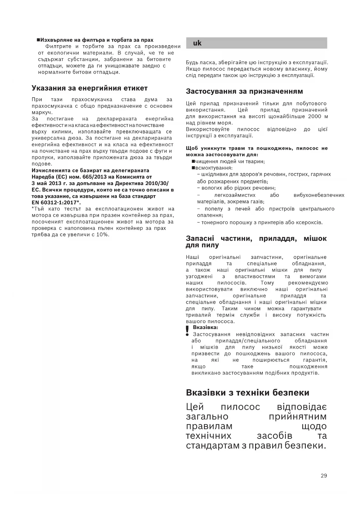 Застосування невідповідних запасних частин або приладдя/спеціального обладнання і мішків для пилу низької якості може призвести до пошкоджень вашого пилососа, на які не поширюється гарантія, якщо таке пошкодження викликано застосуванням подібних продуктів. Вказівки з техніки безпеки Цей пилосос відповідає загально прийнятним правилам щодо технічних засобів та стандартам з правил безпеки.30 Діти до 8 років, особи з фізичними чи розумовими вадами або особи, які не мають достатнього досвіду та знань, можуть користуватися приладом лише під наглядом або якщо вони навчені правильному користуванню пилососом та усвідомлюють можливі