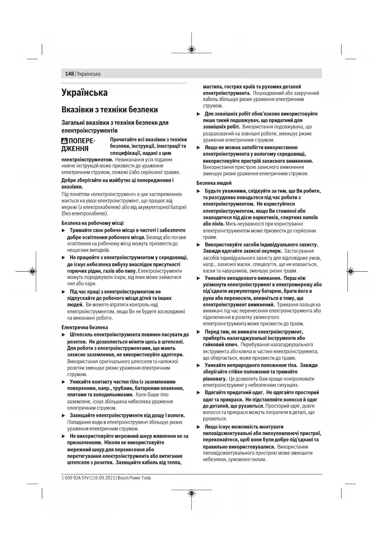 u Якщо існує можливість монтувати пиловідсмоктувальні або пилоуловлюючі пристрої, переконайтеся, щоб вони були добре під’єднані та правильно використовувалися. Використання пиловідсмоктувального пристрою може зменшити небезпеки, зумовлені пилом. 1 609 92A 5YV | (16.09.2021) Bosch Power ToolsУкраїнська | 149 u Добре знання електроінструментів, отримане в результаті частого їх використання, не повинно призводити до самовпевненості й ігнорування принципів техніки безпеки. Необережна дія може в одну мить призвести до важкої травми. Правильне поводження та користування електроінструментами u Не перевантажуйте електроінструмент. Використовуйте такий електроінструмент, що спеціально призначений для відповідної роботи. Зпридатним електроінструментом Ви з меншим ризиком отримаєте кращі результати роботи, якщо будете працювати в зазначеному діапазоні потужності. u Не користуйтеся електроінструментом з пошкодженим вимикачем. Електроінструмент, який не вмикається або не вимикається, є небезпечним і його треба відремонтувати. u Перед тим, як регулювати що-небудь в електроінструменті, міняти приладдя або ховати електроінструмент, витягніть штепсель із розетки та/або витягніть акумуляторну батарею. Ці попереджувальні заходи з техніки безпеки зменшують ризик випадкового запуску електроінструмента. u Ховайте електроінструменти, якими Ви саме не користуєтеся, від дітей. Не дозволяйте користуватися електроінструментом особам, що не знайомі з його роботою або не читали ці вказівки. Використання електроінструментів недосвідченими особами може бути небезпечним. u Старанно доглядайте за електроінструментами і приладдям. Перевіряйте, щоб рухомі деталі електроінструмента були правильно розташовані та не заїдали, не були пошкодженими або у будь- якому іншому стані, який міг би вплинути на функціонування електроінструмента. Пошкоджені електроінструменти потрібно відремонтувати, перш ніж користуватися ними знову. Велика кількість нещасних випадків спричиняється поганим доглядом за електроінструментами. u Тримайте різальні інструменти нагостреними та в чистоті. Старанно доглянуті різальні інструменти з гострим різальним краєм менше застряють та легші в експлуатації. u Використовуйте електроінструмент, приладдя до нього, робочі інструменти тощо відповідно до цих вказівок. Беріть до уваги при цьому умови роботи та специфіку виконуваної роботи. Використання електроінструментів для робіт, для яких вони не передбачені, може призвести до небезпечних