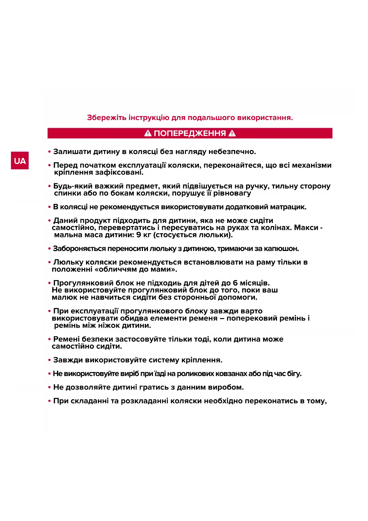 - При складанні та розкладанні коляски необхідно переконатись в тому, ПОПЕРЕДЖЕННЯ Збережіть інструкцію для подальшого використання.що дитина знаходиться на безпечній відстані від неї.
