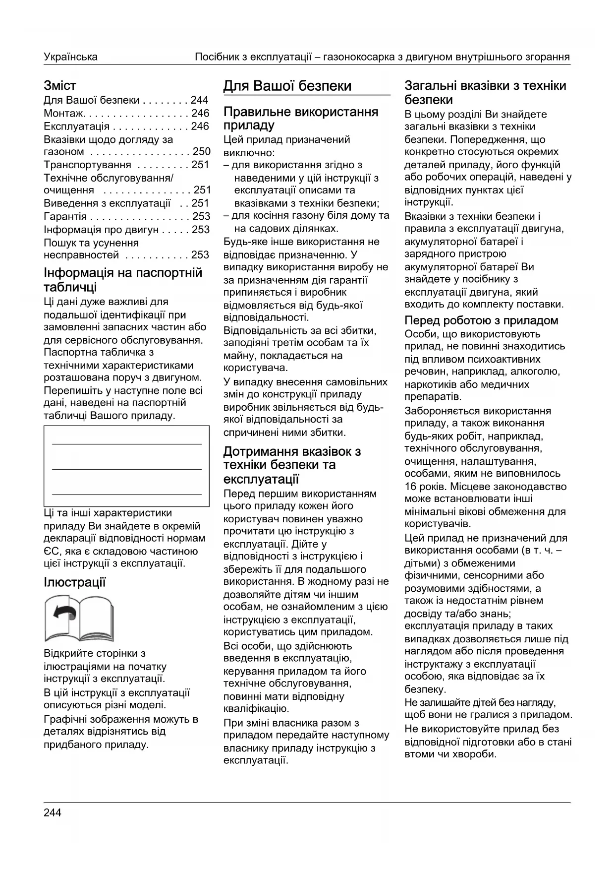 Не залишайте дітей без нагляду, щоб вони не гралися з приладом. Не використовуйте прилад без відповідної підготовки або в стані втоми чи хвороби.Посібник з експлуатації – газонокосарка з двигуном внутрішнього згорання Українська