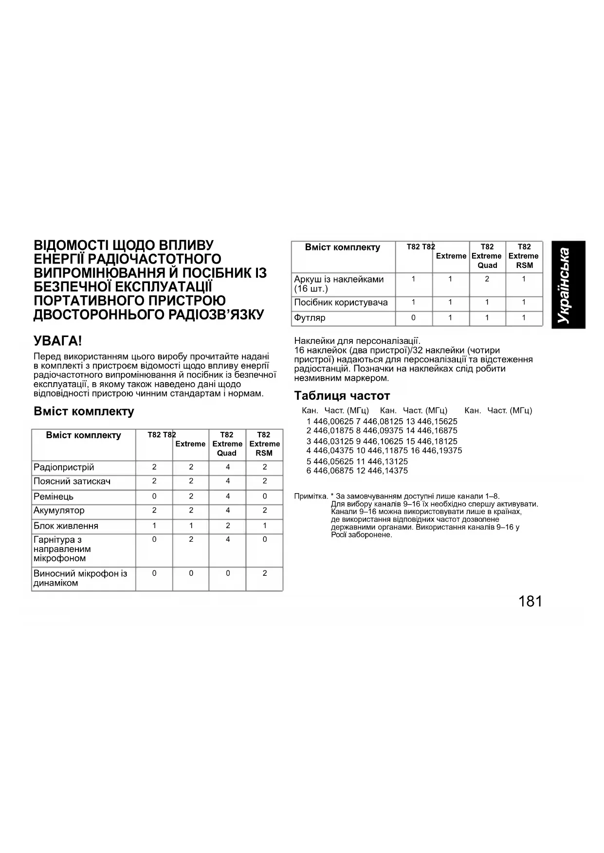 Перед використанням цього виробу прочитайте надані в комплекті з пристроєм відомості щодо впливу енергії радіочастотного випромінювання й посібник із безпечної експлуатації, в якому також наведено дані щодо відповідності пристрою чинним стандартам і нормам. Вміст комплекту Наклейки для персоналізації. 16 наклейок (два пристрої)/32 наклейки (чотири пристрої) надаються для персоналізації та відстеження радіостанцій. Позначки на наклейках слід робити незмивним маркером. Таблиця частот Примітка. * За замовчуванням доступні лише канали 1–8. Для вибору каналів 9–16 їх необхідно спершу активувати. Канали 9–16 можна використовувати лише в країнах, де використання відповідних частот дозволене державними органами. Використання каналів 9–16 у Росії заборонене. Вміст комплекту T82 T82 Extreme T82 Extreme Quad T82 Extreme RSM Радіопристрій