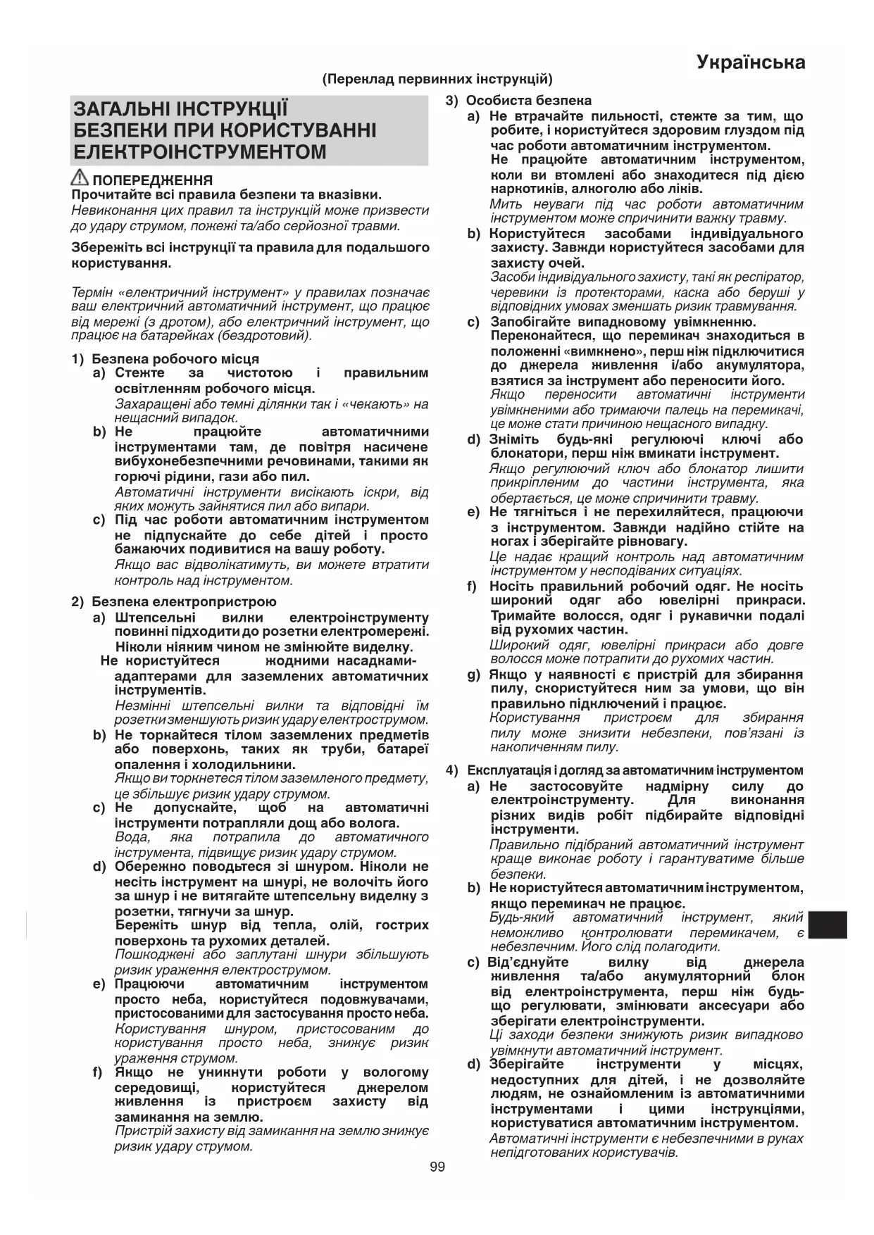 Експлуатація і догляд за автоматичним інструментом a) Не застосовуйте надмірну силу до електроінструменту. Для виконання різних видів робіт підбирайте відповідні інструменти. Правильно підібраний автоматичний інструмент краще виконає роботу і гарантуватиме більше