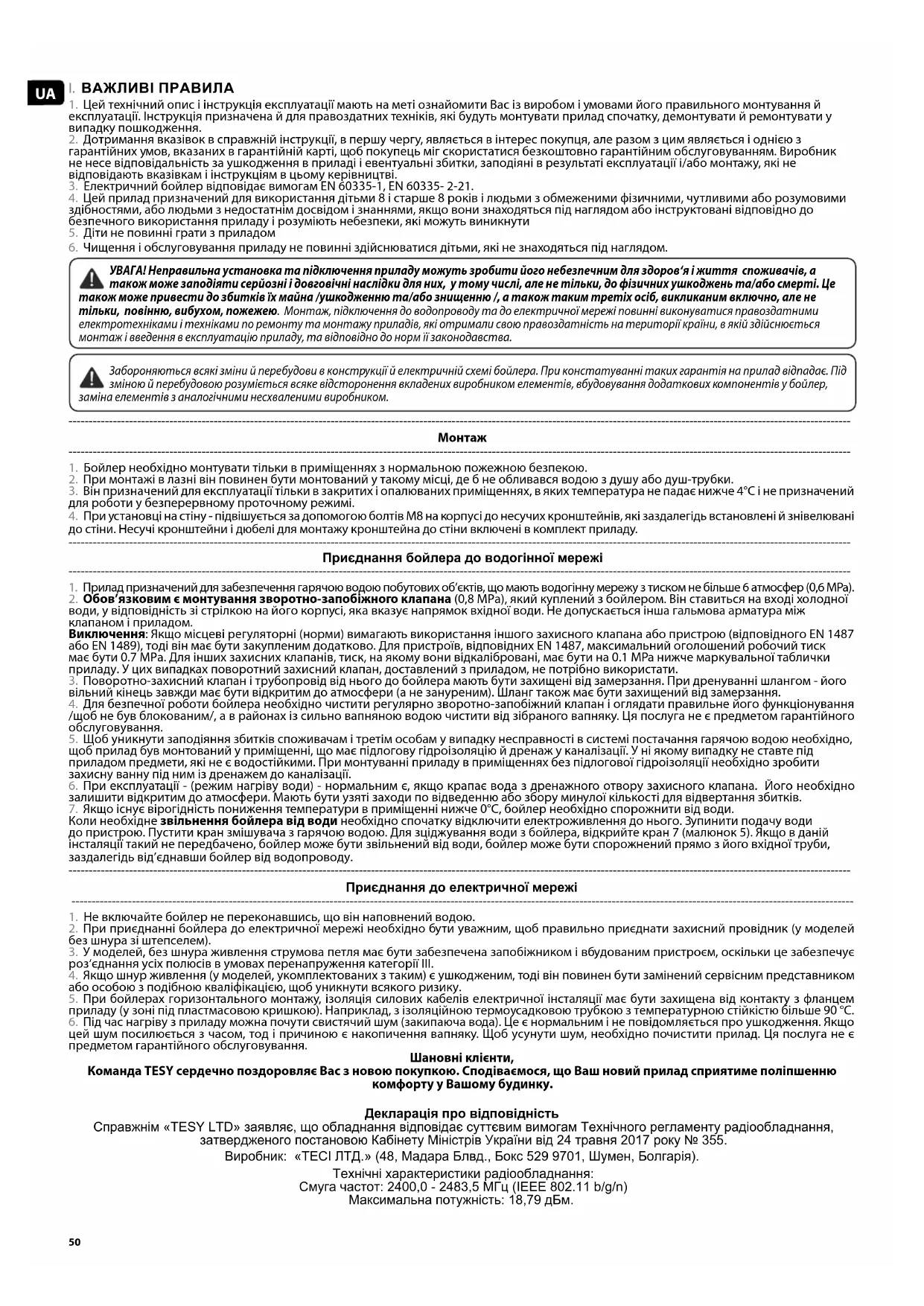 2. При приєднанні бойлера до електричної мережі необхідно бути уважним, щоб правильно приєднати захисний провідник (у моделей без шнура зі штепселем). 3. У моделей, без шнура живлення струмова петля має бути забезпечена запобіжником і вбудованим пристроєм, оскільки це забезпечує роз‘єднання усіх полюсів в умовах перенапруження категорії III. 4. Якщо шнур живлення (у моделей, укомплектованих з таким) є ушкодженим, тоді він повинен бути замінений сервісним представником або особою з подібною кваліфікацією, щоб уникнути всякого ризику. 5. При бойлерах горизонтального монтажу, iзоляція силових кабелів електричної інсталяції має бути захищена від контакту з фланцем приладу (у зоні під пластмасовою кришкою). Наприклад, з ізоляційною термоусадковою трубкою з температурною стійкістю більше 90 °C. 6. Під час нагріву з приладу можна почути свистячий шум (закипаюча вода). Це є нормальним і не повідомляється про ушкодження. Якщо цей шум посилюється з часом, тод і причиною є накопичення вапняку. Щоб усунути шум, необхідно почистити прилад. Ця послуга не є предметом гарантійного обслуговування. Шановні клієнти, Команда TESY сердечно поздоровляє Вас з новою покупкою. Сподіваємося, що Ваш новий прилад сприятиме поліпшенню комфорту у Вашому будинку. Декларація про відповідність Справжнім «TESY LTD» заявляє, що обладнання відповідає суттєвим вимогам Технічного регламенту радіообладнання, затвердженого постановою Кабінету Міністрів України від 24 травня 2017 року № 355. Виробник: «ТЕСІ ЛТД.» (48, Мадара Блвд., Бокс 529 9701, Шумен, Болгарія). Технічні характеристики радіообладнання: Смуга частот: 2400,0 - 2483,5 МГц (IEEE 802.11 b/g/n) Максимальна потужність: 18,79 дБм.51Українська