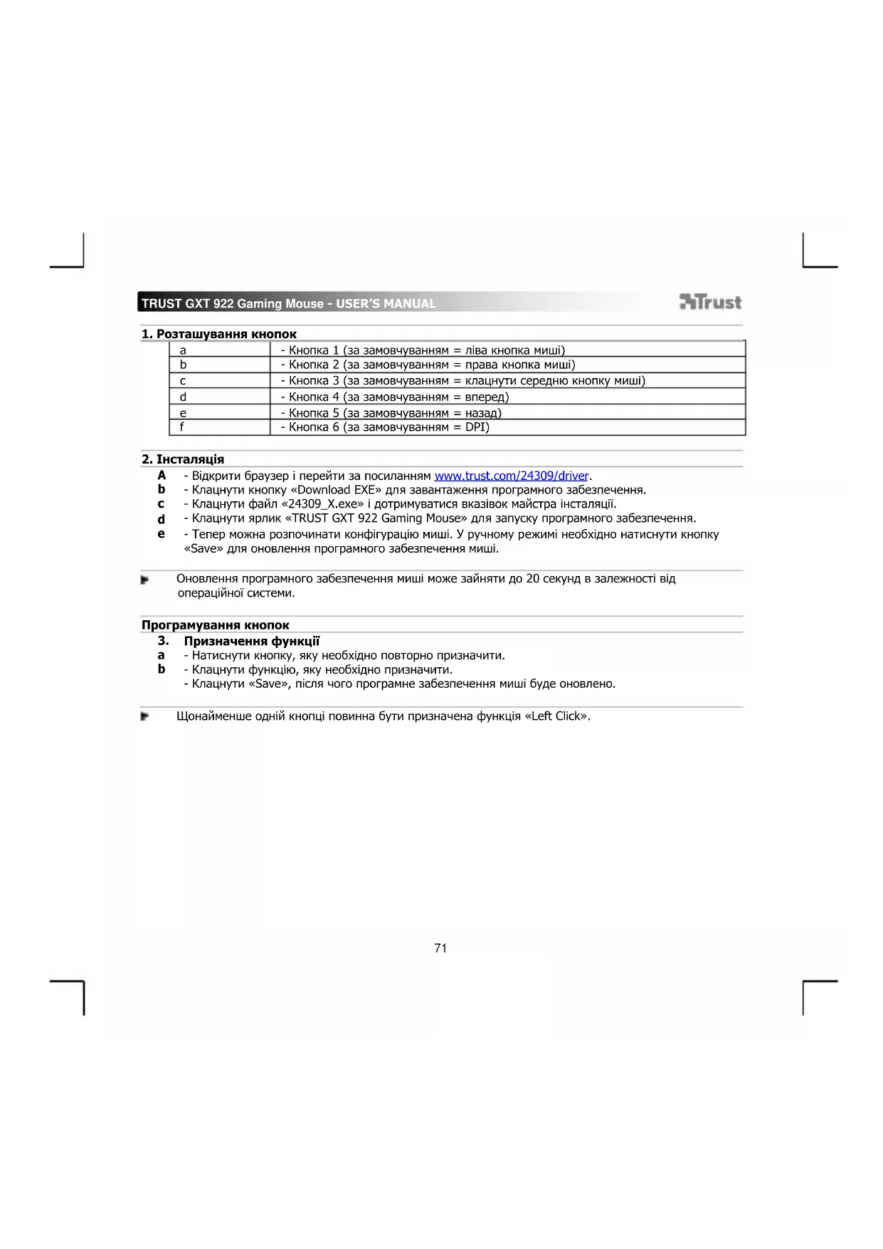 - Відкрити браузер і перейти за посиланням www.trust.com/24309/driver. - Клацнути кнопку «Download EXE» для завантаження програмного забезпечення. - Клацнути файл «24309_X.exe» і дотримуватися вказівок майстра інсталяції. - Клацнути ярлик «TRUST GXT 922 Gaming Mouse» для запуску програмного забезпечення. - Тепер можна розпочинати конфігурацію миші. У ручному режимі необхідно натиснути кнопку «Save» для оновлення програмного забезпечення миші. Оновлення програмного забезпечення миші може зайняти до 20 секунд в залежності від операційної системи. Програмування кнопок