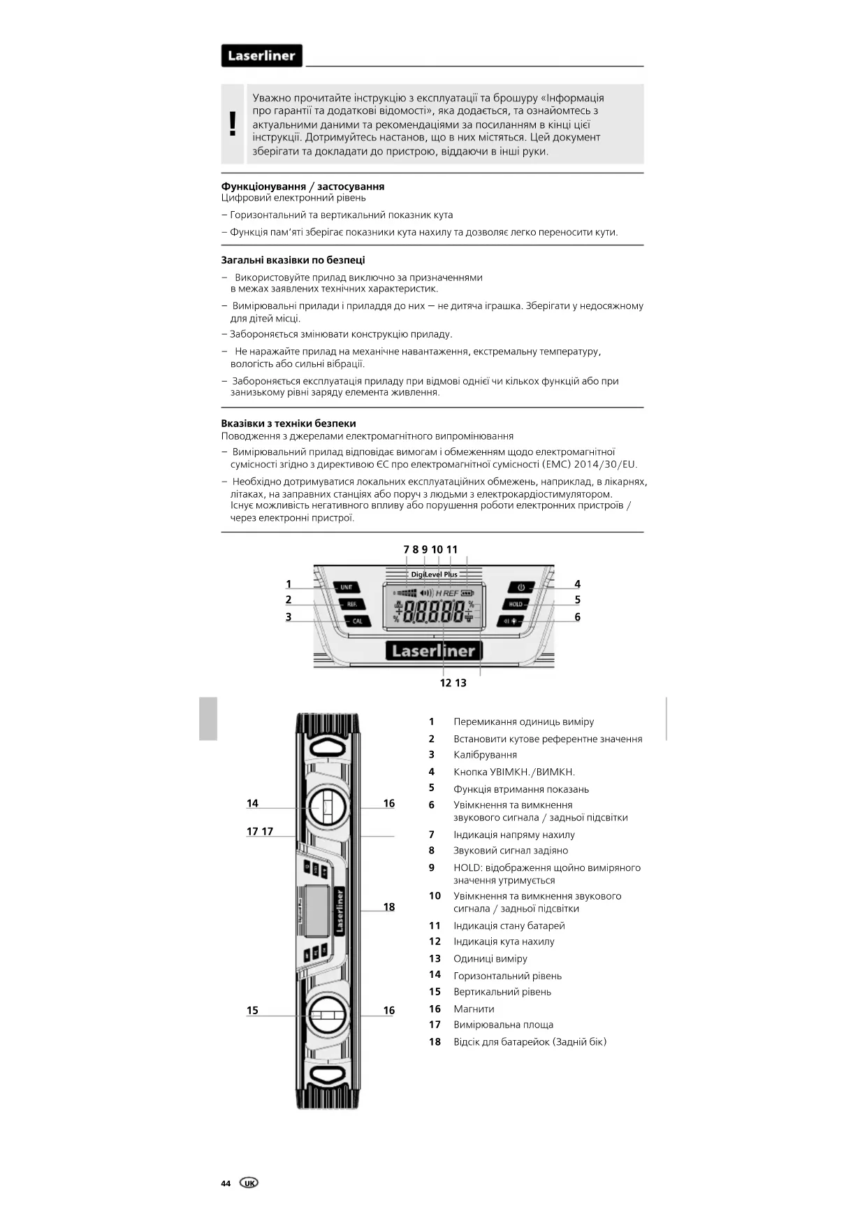 Функціонування / застосування Цифровий електронний рівень – Горизонтальний та вертикальний показник кута – Функція пам‘яті зберігає показники кута нахилу та дозволяє легко переносити кути. Загальні вказівки по безпеці – Використовуйте прилад виключно за призначеннями в межах заявлених технічних характеристик. – Вимірювальні прилади і приладдя до них — не дитяча іграшка. Зберігати у недосяжному для дітей місці. – Забороняється змінювати конструкцію приладу. – Не наражайте прилад на механічне навантаження, екстремальну температуру, вологість або сильні вібрації. – Забороняється експлуатація приладу при відмові однієї чи кількох функцій або при занизькому рівні заряду елемента живлення. Вказівки з техніки безпеки Поводження з джерелами електромагнітного випромінювання – Вимірювальний прилад відповідає вимогам і обмеженням щодо електромагнітної сумісності згідно з директивою ЄС про електромагнітної сумісності (EMC) 2014/30/EU. – Необхідно дотримуватися локальних експлуатаційних обмежень, наприклад, в лікарнях, літаках, на заправних станціях або поруч з людьми з електрокардіостимулятором. Існує можливість негативного впливу або порушення роботи електронних пристроїв / через електронні пристрої. DigiLevel Plus