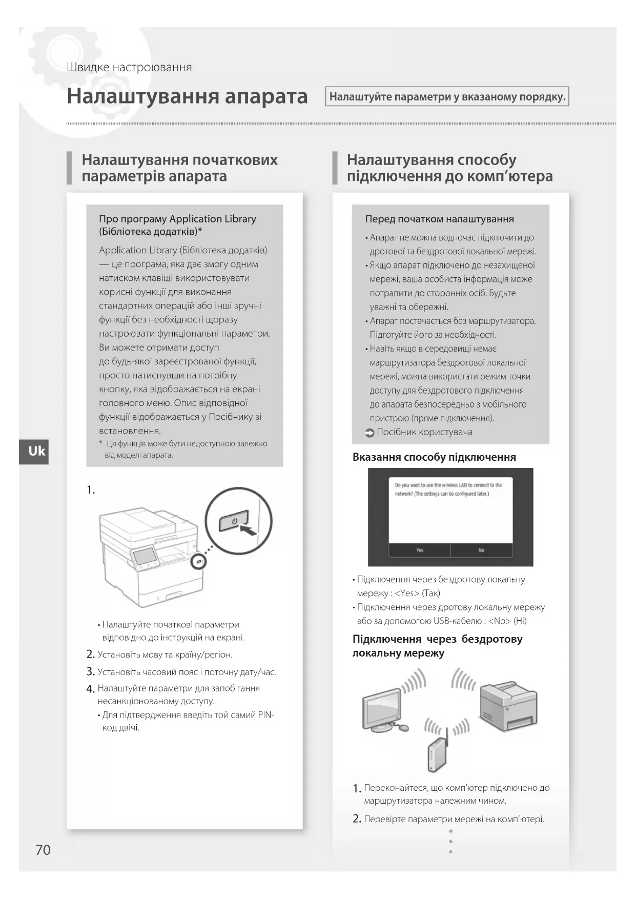 - Налаштуйте початкові параметри відповідно до інструкцій на екрані. Установіть мову та країну/регіон. Установіть часовий пояс і поточну дату/час. Налаштуйте параметри для запобігання несанкціонованому доступу.• Для підтвердження введіть той самий PIN-код двічі.Перед початком налаштування Апарат не можна водночас підключити до дротової та бездротової локальної мережі. Якщо апарат підключено до незахищеної мережі, ваша особиста інформація може потрапити до сторонніх осіб. Будьте уважні та обережні. Апарат постачається без маршрутизатора. Підготуйте його за необхідності. Навіть якщо в середовищі немає маршрутизатора бездротової локальної мережі, можна використати режим точки доступу для бездротового підключення до апарата безпосередньо з мобільного пристрою (пряме підключення). Посібник користувачаВказання способу підключення• Підключення через бездротову локальну мережу : <Yes> (Так)• Підключення через дротову локальну мережу або за допомогою USB-кабелю : <No> (Ні)Підключення через бездротову локальну мережу Переконайтеся, що комп’ютер підключено до маршрутизатора належним чином. Перевірте параметри мережі на комп’ютері.