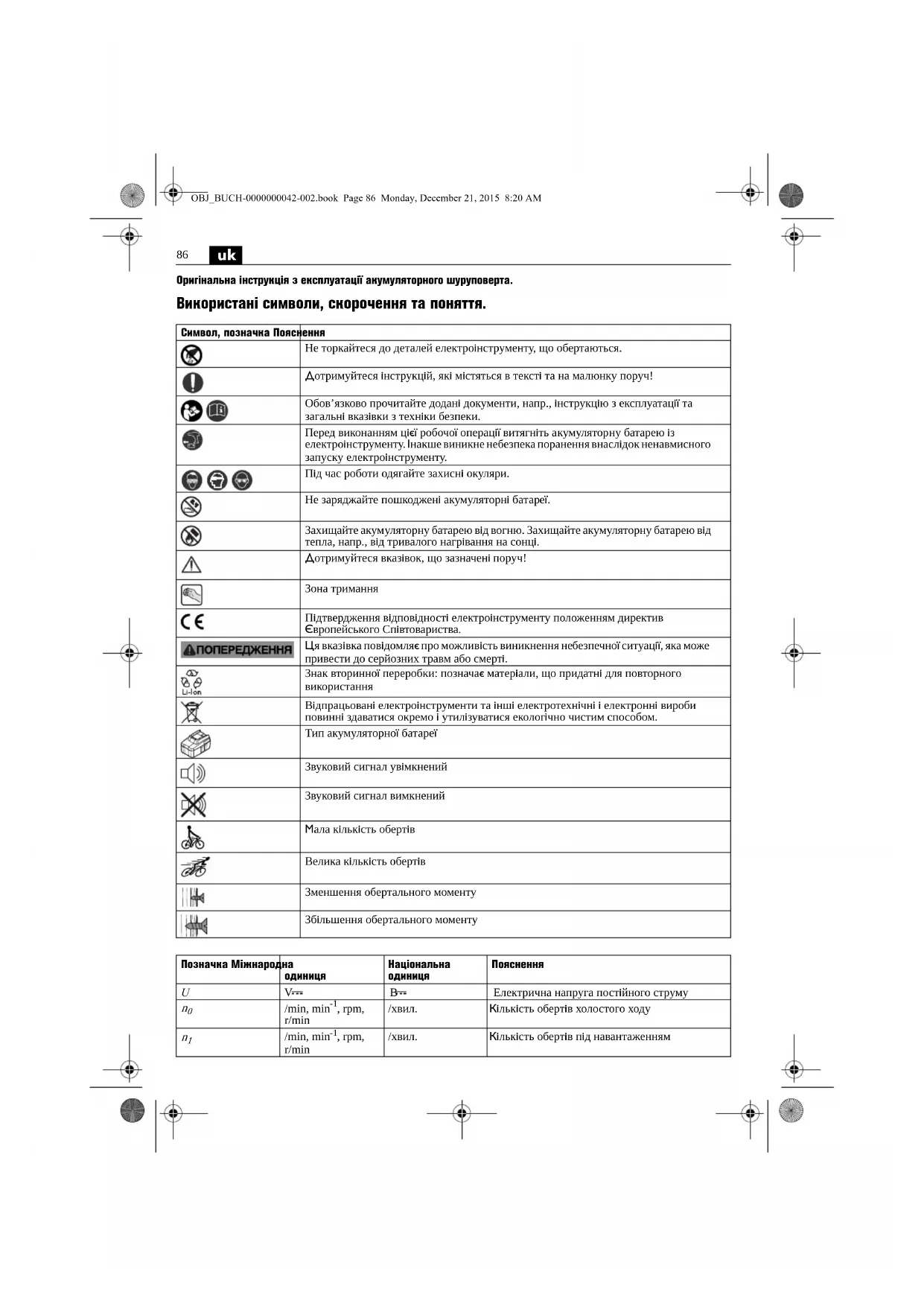 Не розбирайте, не відкривайте і не розколюйте акумуляторні батареї. Не піддавайте акумуляторні батареї впливу механічних ударів. При пошкодженні або неправильній експлуатації акумуляторних батарей може виходити шкідливий пар або рідина. Пар може подразнювати дихальні шляхи. Витекла рідина з акумуляторної батареї може викликати подразнення шкіри або хімічні опіки. Якщо рідина, що витекла із пошкодженої акумуляторної батареї, потрапила на оточуючі предмети, огляньте ці предмети, за необхідністю очистіть їх або замініть. M... Nm Нм Обертальний момент (закручування в тверді/м’які матеріали) inch дюйм Шестигранний патрон mm мм Діаметр шурупа kg кг Вага відповідно до EPTA-Procedure 01