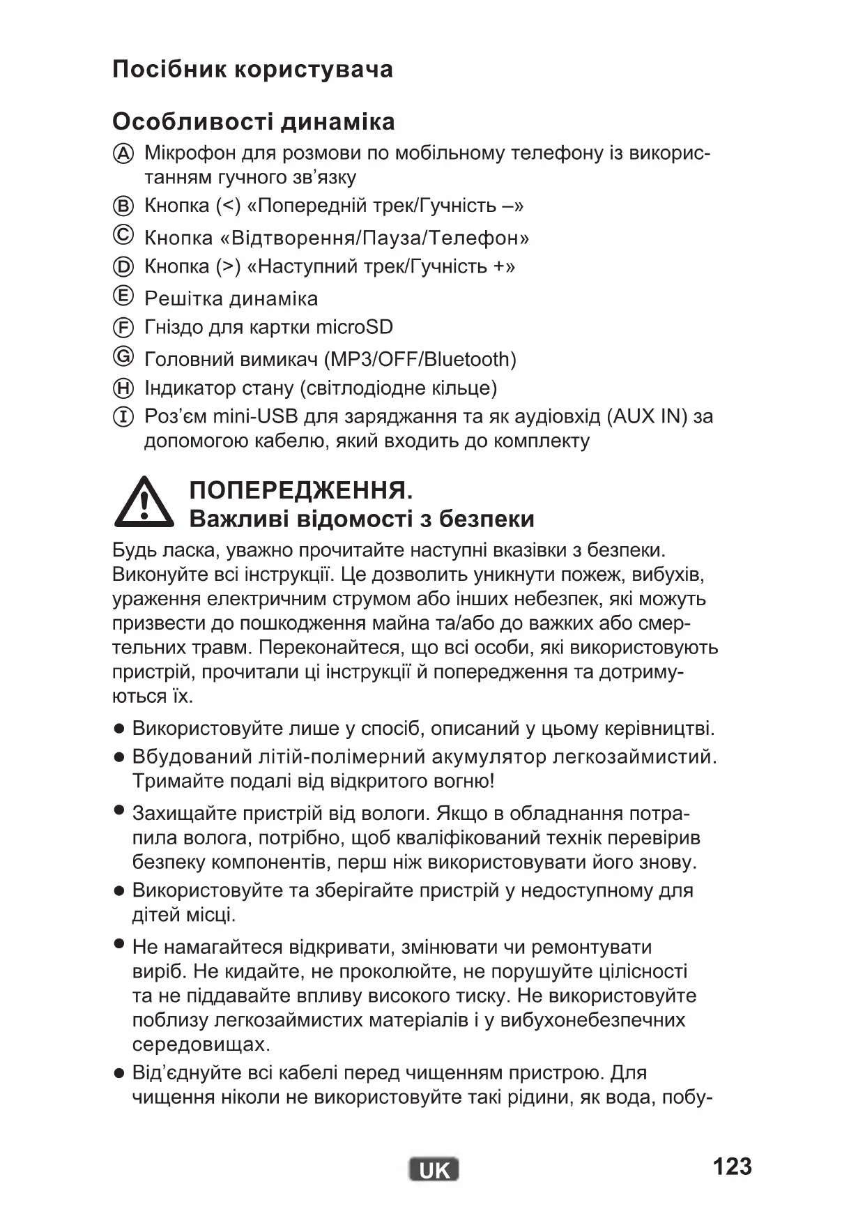 Роз’єм mini-USB для заряджання та як аудіовхід (AUX IN) за допомогою кабелю, який входить до комплекту ПОПЕРЕДЖЕННЯ. Важливі відомості з безпеки Будь ласка, уважно прочитайте наступні вказівки з безпеки. Виконуйте всі інструкції. Це дозволить уникнути пожеж, вибухів, ураження електричним струмом або інших небезпек, які можуть призвести до пошкодження майна та/або до важких або смер- тельних травм. Переконайтеся, що всі особи, які використовують пристрій, прочитали ці інструкції й попередження та дотриму-