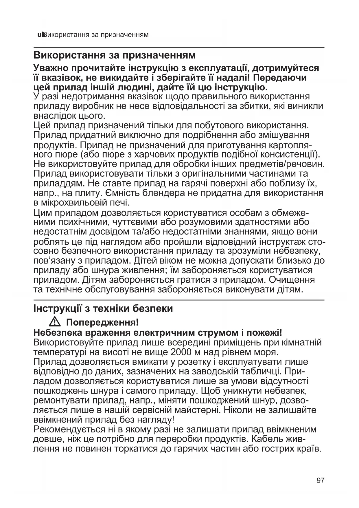 Використаннязапризначенням Використання за призначенням Уважно прочитайте інструкцію з експлуатації, дотримуйтеся її вказівок, не викидайте і зберігайте її надалі! Передаючи цей прилад іншій людині, дайте їй цю інструкцію. Уразінедотриманнявказівокщодоправильноговикористання приладувиробникненесевідповідальностізазбитки,яківиникли внаслідокцього. Цейприладпризначенийтількидляпобутовоговикористання. Приладпридатнийвиключнодляподрібненняабозмішування продуктів.Приладнепризначенийдляприготуваннякартопля- ногопюре(абопюрезхарчовихпродуктівподібноїконсистенції). Невикористовуйтеприладдляобробкиіншихпредметів/речовин. Приладвикористовуватитількизоригінальнимичастинамита приладдям.Неставтеприладнагарячіповерхніабопоблизуїх, напр.,наплиту.Ємністьблендеранепридатнадлявикористання вмікрохвильовійпечі. Цимприладомдозволяєтьсякористуватисяособамзобмеже- нимипсихічними,чуттєвимиаборозумовимиздатностямиабо недостатнімдосвідомта/абонедостатнімизнаннями,якщовони роблятьцепіднаглядомабопройшливідповіднийінструктажсто- совнобезпечноговикористанняприладутазрозумілинебезпеку, пов’язанузприладом.Дітейвікомнеможнадопускатиблизькодо приладуабошнураживлення;їмзабороняєтьсякористуватися приладом.Дітямзабороняєтьсягратисязприладом.Очищення татехнічнеобслуговуваннязабороняєтьсявиконуватидітям. Інструкції з техніки безпеки W Попередження! Небезпека враження електричним струмом і пожежі! Використовуйтеприладлишевсерединіприміщеньприкімнатній температурінависотіневище2000мнадрівнемморя. Приладдозволяєтьсявмикатиурозеткуіексплуатуватилише відповіднододаних,зазначенихназаводськійтабличці.При- ладомдозволяєтьсякористуватисялишезаумовивідсутності пошкодженьшнураісамогоприладу.Щобуникнутинебезпек, ремонтуватиприлад,напр.,мінятипошкодженийшнур,дозво- ляєтьсялишевнашійсервісніймайстерні.Ніколинезалишайте ввімкненийприладбезнагляду! Рекомендуєтьсянівякомуразінезалишатиприладввімкненим довше,ніжцепотрібнодляпереробкипродуктів.Кабельжив- леннянеповиненторкатисядогарячихчастинабогострихкраїв.98 uk Інструкціїзтехнікибезпеки Нівякомуразінезанурюватиосновнийблокуводуінемити впосудомийніймашині.Некористуватисяприладомвологими рукамитанеексплуатуватийогонахолостомуходу. Незанурюватиприладвпродуктипереробкиповерхмісцяз’єд- нанняніжкиблендеразосновнимблоком.Приладнеобхідно постійновимикатизмережіпередкожнимвикористанням,за відсутностідогляду,передмонтажем,демонтажемчичищенням тауразінесправності. W Попередження! Небезпека травмування! Відразужпіслявикористанняприладуслідпочекати,щобповні- стюзупинивсяніжніжкиблендера.Передзаміноюприладдяабо комплектуючихелементів,якірухаютьсяпідчасроботи,виріб слідвимкнутитавід‘єднативіделектромережі.Ніколинабратися рукамизаніжніжкиблендера.Ніколинечиститиніжніжкиблен- дераголимируками. W Попередження! Небезпека отримання опіків! Обережноприобробцігарячихпродуктів.Припереробцігарячі продуктиможутьрозбризкуватися.Ніжкублендеранівякому разінеставитинагарячіповерхнітаневикористовуватидля переробкидужегарячихпродуктів.Кип’ячіпродуктипередпере- робкоюохолодитидотемператури80°Сабонижче!Привико- ристанніручногоблендеравкаструліїїслідзаздалегідьзнятиз