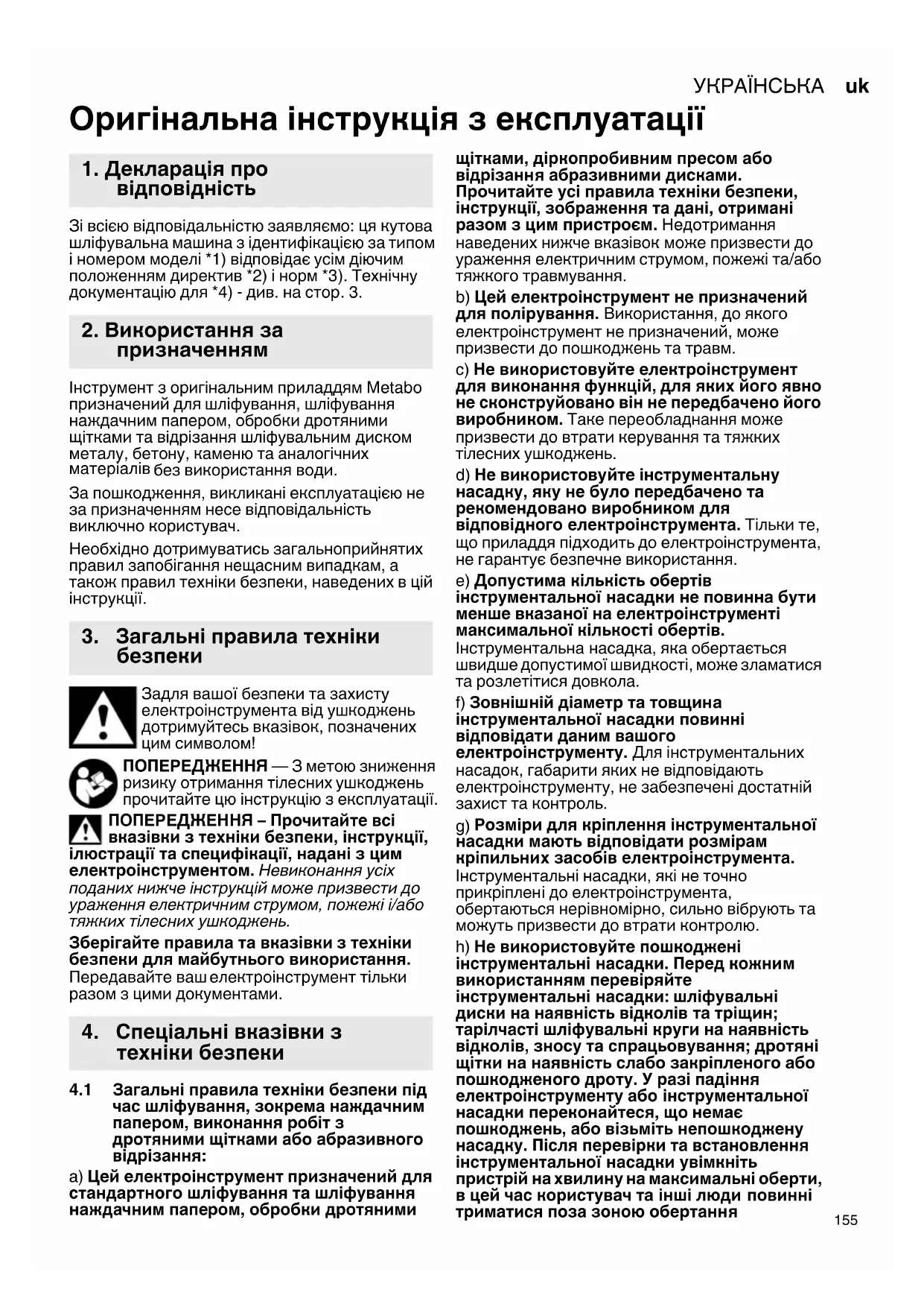 Оригінальна інструкція з експлуатації Зі всією відповідальністю заявляємо: ця кутова шліфувальна машина з ідентифікацією за типом і номером моделі *1) відповідає усім діючим положенням директив *2) і норм *3). Технічну документацію для *4) - див. на стор. 3. Інструмент з оригінальним приладдям Metabo призначений для шліфування, шліфування наждачним папером, обробки дротяними щітками та відрізання шліфувальним диском металу, бетону, каменю та аналогічних