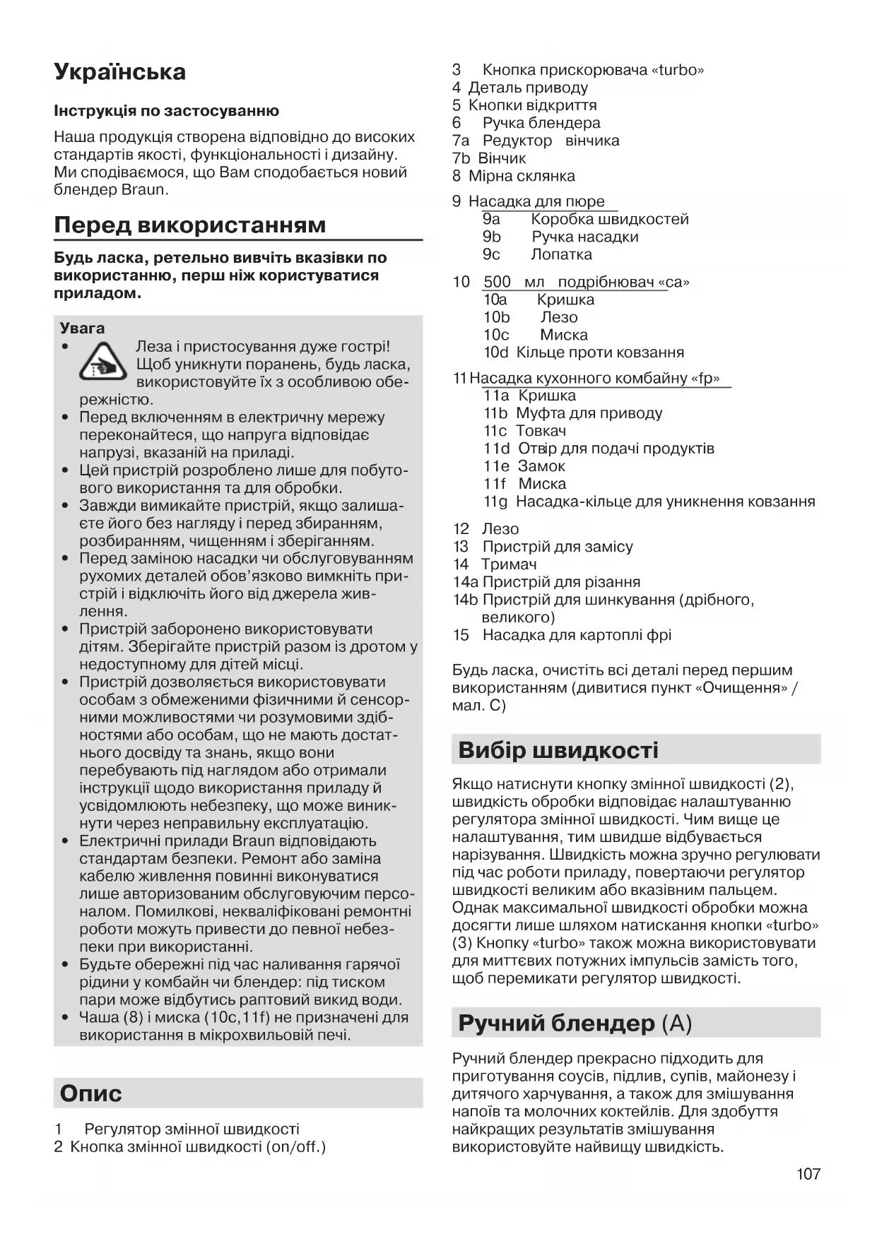 1 Регулятор змінної швидкості 2 Кнопка змінної швидкості (on/off.) 3 Кнопка прискорювача «turbo» 4 Деталь приводу 5 Кнопки відкриття 6 Ручка блендера 7а Редуктор вінчика 7b Вінчик 8 Мірна склянка 9 Насадка для пюре 9а Коробка швидкостей 9b Ручка насадки 9c Лопатка 10 500 мл подрібнювач «ca» 10а Кришка 10b Лезо 10c Миска 10d Кільце проти ковзання 11 Насадка кухонного комбайну «fp» 11a Кришка 11b Муфта для приводу 11c Товкач 11d Отв ір для подачі продуктів 11e Замок 11f Миска 11g Насадка-кільце для уникнення ковзання 12 Лезо 13 Пристрій для замісу 14 Тримач 14a Пристрій для різання 14b Пристрій для шинкування (дрібного,