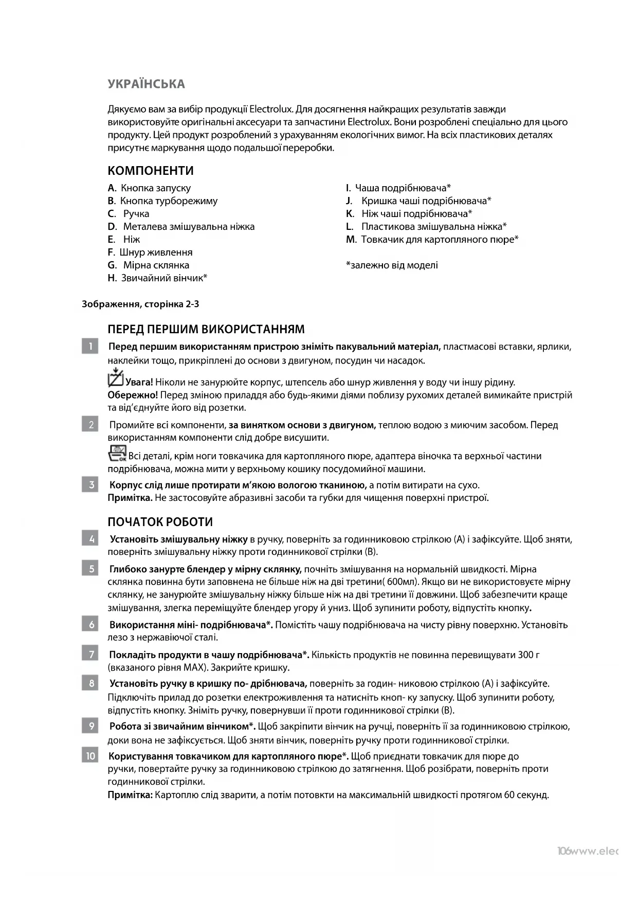 J. Кришка чаші подрібнювача* K. Ніж чаші подрібнювача* L. Пластикова змішувальна ніжка* M. Товкачик для картопляного пюре* *залежно від моделі Зображення, сторінка 2-3 ПЕРЕД ПЕРШИМ ВИКОРИСТАННЯМ 1 Перед першим використанням пристрою зніміть пакувальний матеріал, пластмасові вставки, ярлики, наклейки тощо, прикріплені до основи з двигуном, посудин чи насадок. Увага! Ніколи не занурюйте корпус, штепсель або шнур живлення у воду чи іншу рідину. Обережно! Перед зміною приладдя або будь-якими діями поблизу рухомих деталей вимикайте пристрій та від’єднуйте його від розетки. 2 Промийте всі компоненти, за винятком основи з двигуном, теплою водою з миючим засобом. Перед використанням компоненти слід добре висушити. Всі деталі, крім ноги товкачика для картопляного пюре, адаптера віночка та верхньої частини подрібнювача, можна мити у верхньому кошику посудомийної машини. 3 Корпус слід лише протирати м’якою вологою тканиною, а потім витирати на сухо. Примітка. Не застосовуйте абразивні засоби та губки для чищення поверхні пристрої. ПОЧАТОК РОБОТИ 4 Установіть змішувальну ніжку в ручку, поверніть за годинниковою стрілкою (A) і зафіксуйте. Щоб зняти, поверніть змішувальну ніжку проти годинникової стрілки (В). 5 Глибоко занурте блендер у мірну склянку, почніть змішування на нормальній швидкості. Мірна склянка повинна бути заповнена не більше ніж на дві третини( 600мл). Якщо ви не використовуєте мірну склянку, не занурюйте змішувальну ніжку більше ніж на дві третини її довжини. Щоб забезпечити краще змішування, злегка переміщуйте блендер угору й униз. Щоб зупинити роботу, відпустіть кнопку. 6 Використання міні- подрібнювача*. Помістіть чашу подрібнювача на чисту рівну поверхню. Установіть лезо з нержавіючої сталі. 7 Покладіть продукти в чашу подрібнювача*. Кількість продуктів не повинна перевищувати 300 г (вказаного рівня MAX). Закрийте кришку. 8 Установіть ручку в кришку по- дрібнювача, поверніть за годин- никовою стрілкою (A) і зафіксуйте. Підключіть прилад до розетки електроживлення та натисніть кноп- ку запуску. Щоб зупинити роботу, відпустіть кнопку. Зніміть ручку, повернувши її проти годинникової стрілки (В). 9 Робота зі звичайним вінчиком*. Щоб закріпити вінчик на ручці, поверніть її за годинниковою стрілкою, доки вона не зафіксується. Щоб зняти вінчик, поверніть ручку проти годинникової стрілки. 10 Користування товкачиком для картопляного пюре*. Щоб приєднати товкачик для пюре до ручки, повертайте ручку за годинниковою стрілкою до затягнення. Щоб розібрати, поверніть проти годинникової стрілки. Примітка: Картоплю слід зварити, а потім потовкти на максимальній швидкості протягом 60 секунд.107www.electrolux.com
