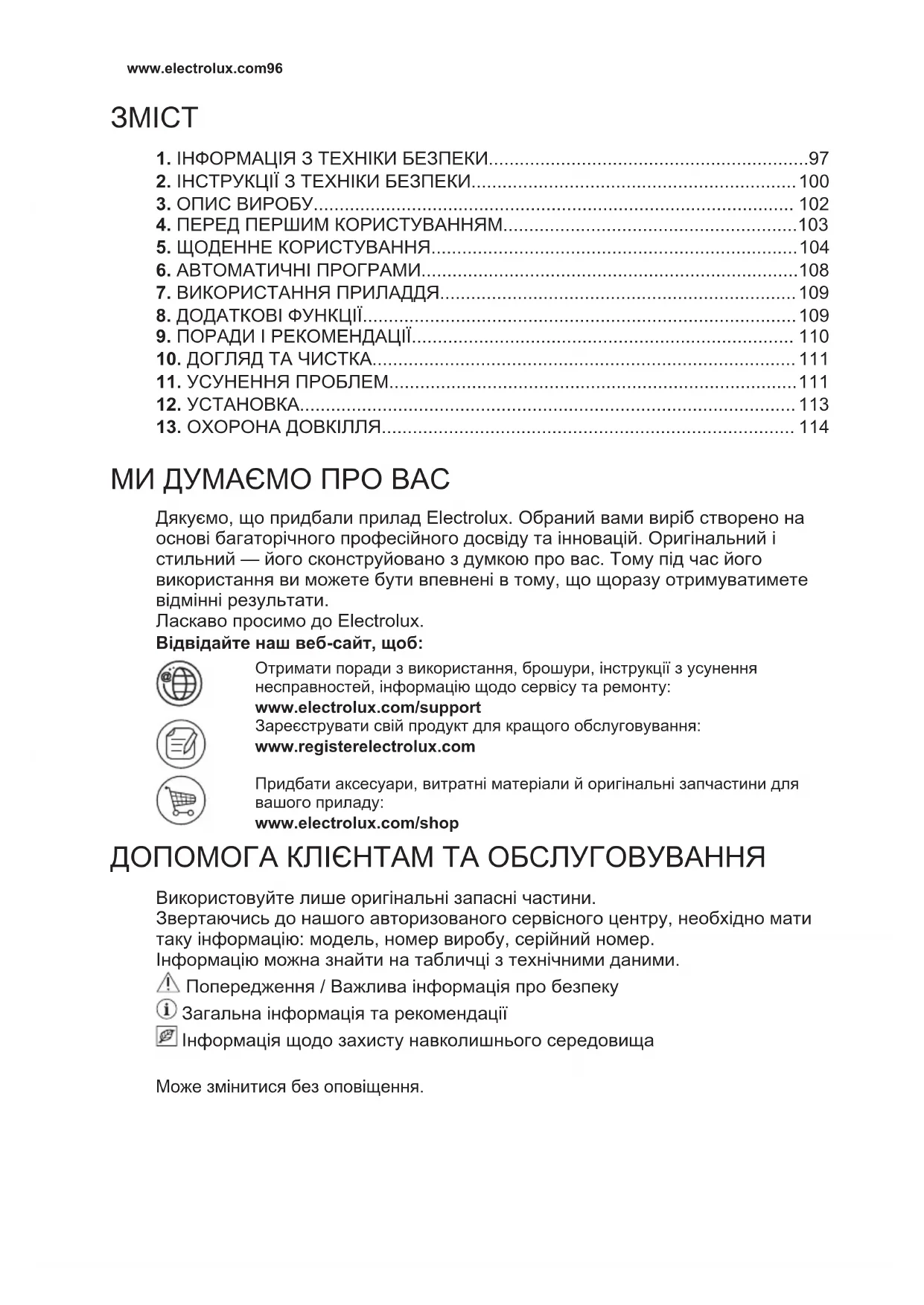 МИ ДУМАЄМО ПРО ВАС Дякуємо, що придбали прилад Electrolux. Обраний вами виріб створено на основі багаторічного професійного досвіду та інновацій. Оригінальний і стильний — його сконструйовано з думкою про вас. Тому під час його використання ви можете бути впевнені в тому, що щоразу отримуватимете відмінні результати. Ласкаво просимо до Electrolux. Відвідайте наш веб-сайт, щоб: Отримати поради з використання, брошури, інструкції з усунення несправностей, інформацію щодо сервісу та ремонту: www.electrolux.com/support Зареєструвати свій продукт для кращого обслуговування: www.registerelectrolux.com Придбати аксесуари, витратні матеріали й оригінальні запчастини для вашого приладу: www.electrolux.com/shop ДОПОМОГА КЛІЄНТАМ ТА ОБСЛУГОВУВАННЯ Використовуйте лише оригінальні запасні частини. Звертаючись до нашого авторизованого сервісного центру, необхідно мати таку інформацію: модель, номер виробу, серійний номер. Інформацію можна знайти на табличці з технічними даними. Попередження / Важлива інформація про безпеку Загальна інформація та рекомендації Інформація щодо захисту навколишнього середовища Може змінитися без оповіщення. www.electrolux.com961. ІНФОРМАЦІЯ З ТЕХНІКИ БЕЗПЕКИ Перед установкою та експлуатацією приладу слід уважно прочитати інструкцію користувача. Виробник не несе відповідальності за травми або збитки через неправильне встановлення або використання. Інструкції з експлуатації слід зберігати в безпечному і доступному місці з метою користування в майбутньому.