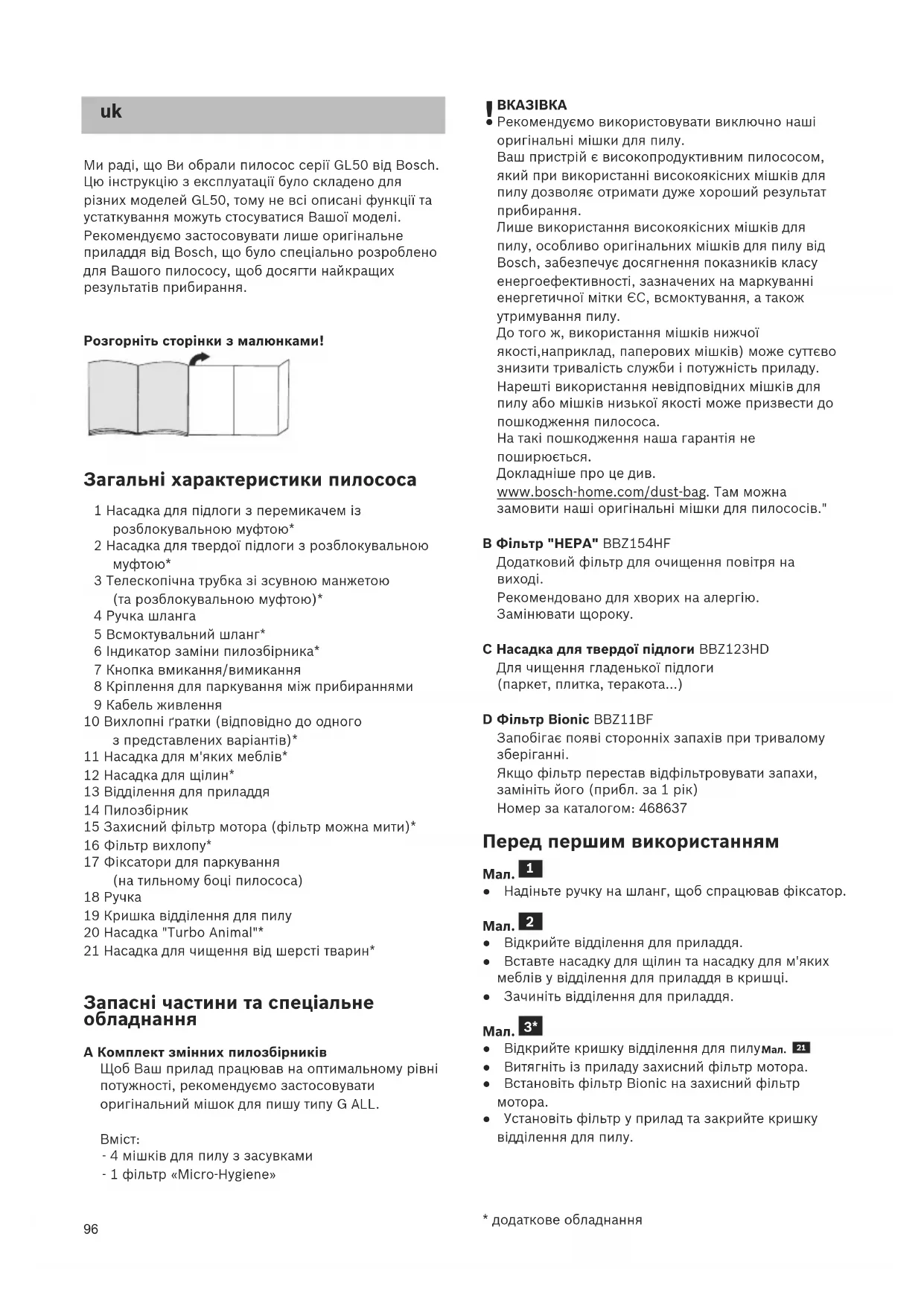 Ми раді, що Ви обрали пилосос серії GL50 від Bosch. Цю інструкцію з експлуатації було складено для різних моделей GL50, тому не всі описані функції та устаткування можуть стосуватися Вашої моделі. Рекомендуємо застосовувати лише оригінальне приладдя від Bosch, що було спеціально розроблено для Вашого пилососу, щоб досягти найкращих результатів прибирання. Розгорніть сторінки з малюнками! Загальні характеристики пилососа 1 Насадка для підлоги з перемикачем із розблокувальною муфтою* 2 Насадка для твердої підлоги з розблокувальною