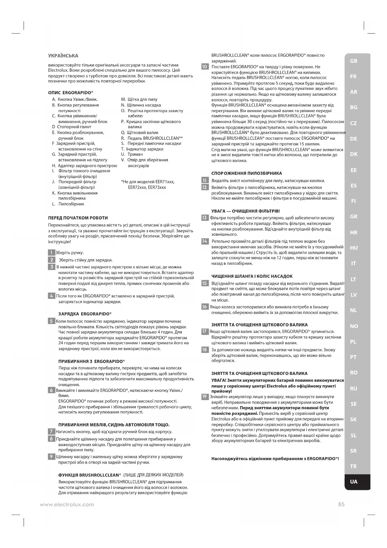 UAУКРАЇНСЬКА використовуйте тільки оригінальні аксесуари та запасні частини Electrolux. Вони розроблені спеціально для вашого пилососу. Цей продукт створено з турботою про довкілля. Всі пластикові деталі мають позначки про можливість повторної переробки. ОПИС ERGORAPIDO® A. Кнопка Увімк./Вимк. B. Кнопка регулювання