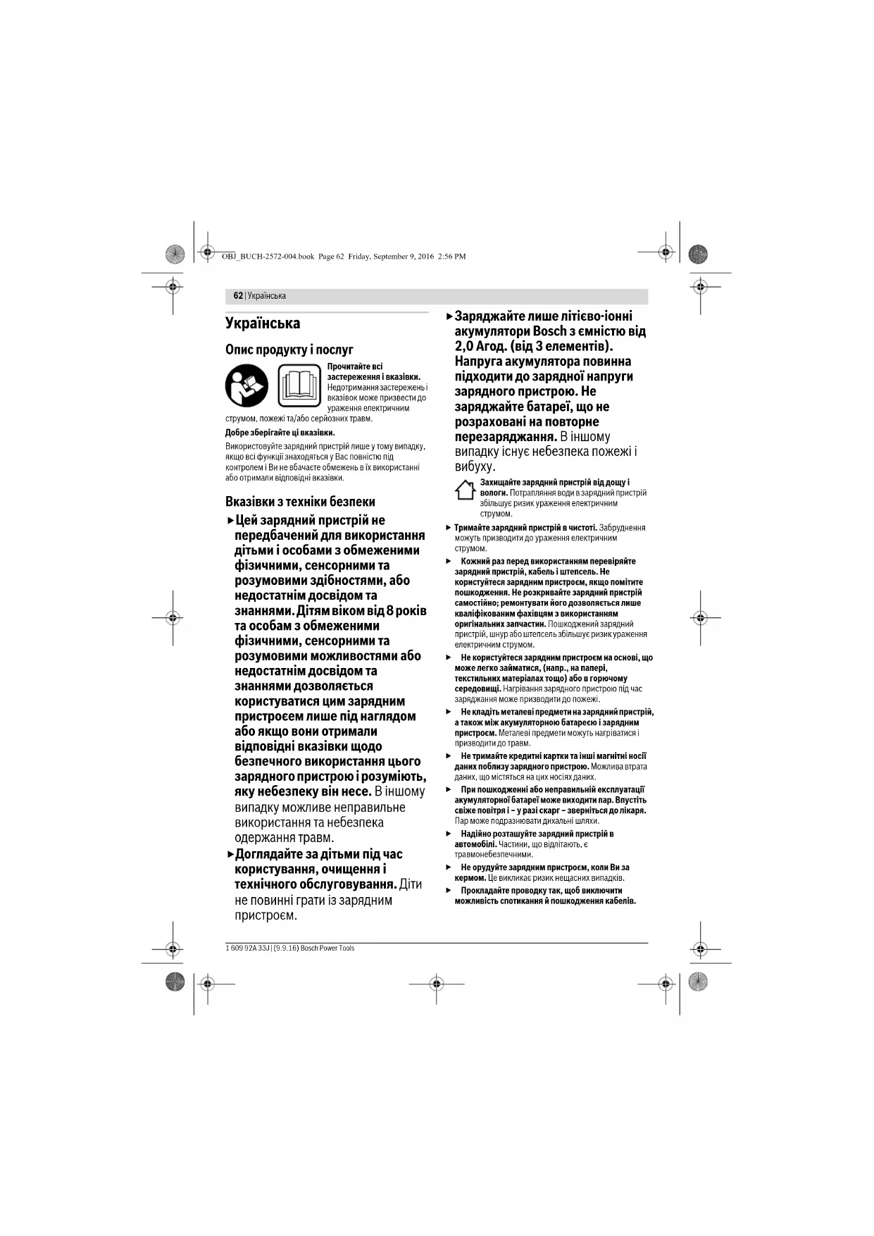 Опис продукту і послуг Прочитайте всі застереження і вказівки. Недотримання застережень і вказівок може призвести до ураження електричним струмом, пожежі та/або серйозних травм. Добре зберігайте ці вказівки. Використовуйте зарядний пристрій лише у тому випадку, якщо всі функції знаходяться у Вас повністю під контролем і Ви не вбачаєте обмежень в їх використанні або отримали відповідні вказівки. Вказівки з техніки безпеки Цей зарядний пристрій не передбачений для використання дітьми і особами з обмеженими фізичними, сенсорними та розумовими здібностями, або недостатнім досвідом та знаннями. Дітям віком від 8 років та особам з обмеженими фізичними, сенсорними та розумовими можливостями або недостатнім досвідом та знаннями дозволяється користуватися цим зарядним пристроєем лише під наглядом або якщо вони отримали відповідні вказівки щодо безпечного використання цього зарядного пристрою і розуміють, яку небезпеку він несе. В іншому випадку можливе неправильне використання та небезпека одержання травм. Доглядайте за дітьми під час користування, очищення і технічного обслуговування. Діти не повинні грати із зарядним
