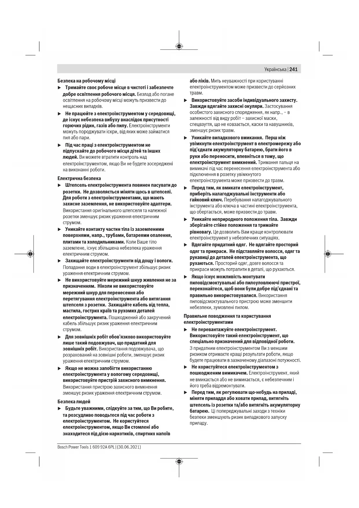 Під поняттям «електроінструмент» в цих застереженнях мається на увазі електроінструмент, що працює від мережі (з електрокабелем) або від акумуляторної батареї (без електрокабелю). 1 609 92A 6PL | (30.06.2021) Bosch Power ToolsУкраїнська | 241 Безпека на робочому місці u Тримайте своє робоче місце в чистоті і забезпечте добре освітлення робочого місця. Безлад або погане освітлення на робочому місці можуть призвести до нещасних випадків. u Не працюйте з електроінструментом у середовищі, де існує небезпека вибуху внаслідок присутності горючих рідин, газів або пилу. Електроінструменти можуть породжувати іскри, від яких може займатися пил або пари. u Під час праці з електроінструментом не підпускайте до робочого місця дітей та інших людей. Ви можете втратити контроль над електроінструментом, якщо Ви не будете зосереджені на виконанні роботи. Електрична безпека u Штепсель електроінструмента повинен пасувати до розетки. Не дозволяється міняти щось в штепселі. Для роботи з електроінструментами, що мають захисне заземлення, не використовуйте адаптери. Використання оригінального штепселя та належної розетки зменшує ризик ураження електричним