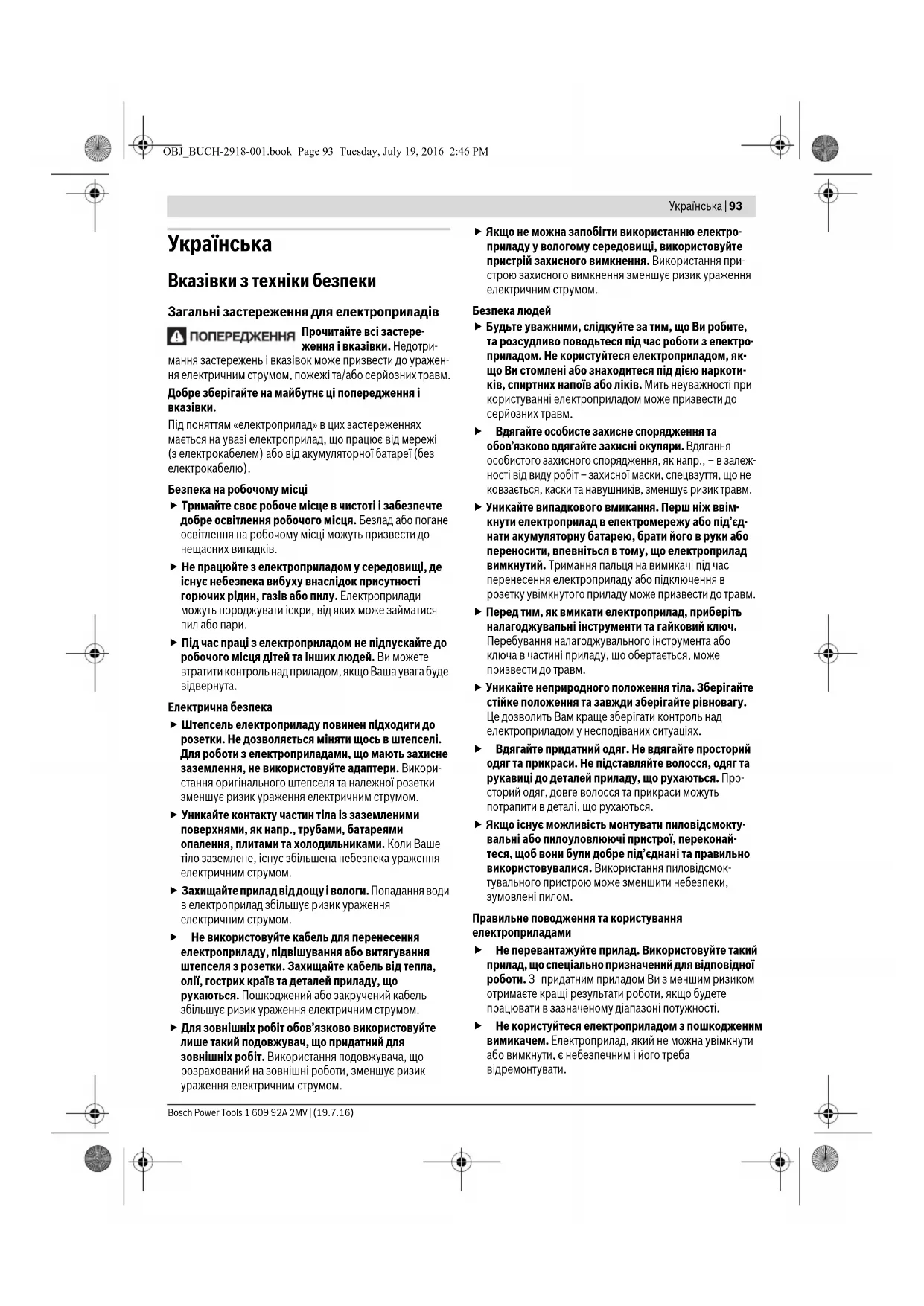 Під поняттям «електроприлад» в цих застереженнях мається на увазі електроприлад, що працює від мережі (з електрокабелем) або від акумуляторної батареї (без електрокабелю). Безпека на робочому місці Тримайте своє робоче місце в чистоті і забезпечте добре освітлення робочого місця. Безлад або погане освітлення на робочому місці можуть призвести до нещасних випадків. Не працюйте з електроприладом у середовищі, де існує небезпека вибуху внаслідок присутності горючих рідин, газів або пилу. Електроприлади можуть породжувати іскри, від яких може займатися пил або пари. Під час праці з електроприладом не підпускайте до робочого місця дітей та інших людей. Ви можете втратити контроль над приладом, якщо Ваша увага буде відвернута. Електрична безпека Штепсель електроприладу повинен підходити до розетки. Не дозволяється міняти щось в штепселі. Для роботи з електроприладами, що мають захисне заземлення, не використовуйте адаптери. Викори- стання оригінального штепселя та належної розетки зменшує ризик ураження електричним струмом. Уникайте контакту частин тіла із заземленими поверхнями, як напр., трубами, батареями опалення, плитами та холодильниками. Коли Ваше тіло заземлене, існує збільшена небезпека ураження електричним струмом. Захищайте прилад від дощу і вологи. Попадання води в електроприлад збільшує ризик ураження електричним струмом. Не використовуйте кабель для перенесення електроприладу, підвішування або витягування штепселя з розетки. Захищайте кабель від тепла, олії, гострих країв та деталей приладу, що рухаються. Пошкоджений або закручений кабель збільшує ризик ураження електричним струмом. Для зовнішніх робіт обов’язково використовуйте лише такий подовжувач, що придатний для зовнішніх робіт. Використання подовжувача, що розрахований на зовнішні роботи, зменшує ризик ураження електричним струмом. Якщо не можна запобігти використанню електро- приладу у вологому середовищі, використовуйте пристрій захисного вимкнення. Використання при- строю захисного вимкнення зменшує ризик ураження електричним струмом. Безпека людей Будьте уважними, слідкуйте за тим, що Ви робите, та розсудливо поводьтеся під час роботи з електро- приладом. Не користуйтеся електроприладом, як- що Ви стомлені або знаходитеся під дією наркоти- ків, спиртних напоїв або ліків. Мить неуважності при користуванні електроприладом може призвести до серйозних травм. Вдягайте особисте захисне спорядження та обов’язково вдягайте захисні окуляри. Вдягання особистого захисного спорядження, як напр., – в залеж- ності від виду робіт– захисної маски, спецвзуття, що не ковзається, каски та навушник ів, зменшує ризик травм. Уникайте випадкового вмикання. Перш ніж ввім- кнути електроприлад в електромережу або під’єд- нати акумуляторну батарею, брати його в руки або переносити, впевніться в тому, що електроприлад вимкнутий. Тримання пальця на вимикачі під час перенесення електроприладу або підключення в розетку увімкнутого приладу може призвести до травм. Перед тим, як вмикати електроприлад, приберіть налагоджувальні інструменти та гайковий ключ. Перебування налагоджувального інструмента або ключа в частині приладу, що обертається, може призвести до травм. Уникайте неприродного положення тіла. Зберігайте стійке положення та завжди зберігайте рівно