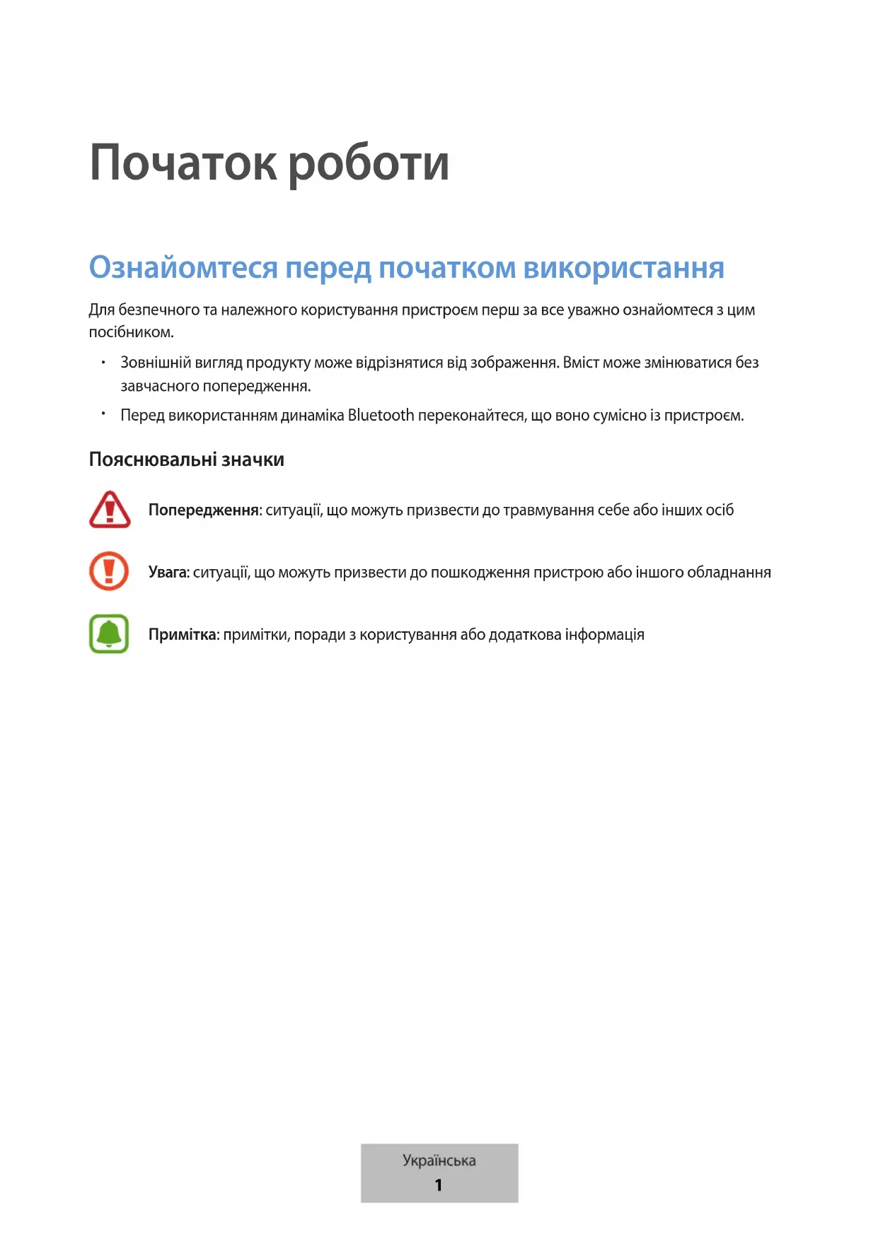 Початок роботи Ознайомтеся перед початком використання Для безпечного та належного користування пристроєм перш за все уважно ознайомтеся з цим посібником. Зовнішній вигляд продукту може відрізнятися від зображення. Вміст може змінюватися без завчасного попередження. Перед використанням динаміка Bluetooth переконайтеся, що воно сумісно із пристроєм. Пояснювальні значки Попередження: ситуації, що можуть призвести до травмування себе або інших осібУвага: ситуації, що можуть призвести до пошкодження пристрою або іншого обладнанняПримітка: примітки, поради з користування або додаткова інформація
