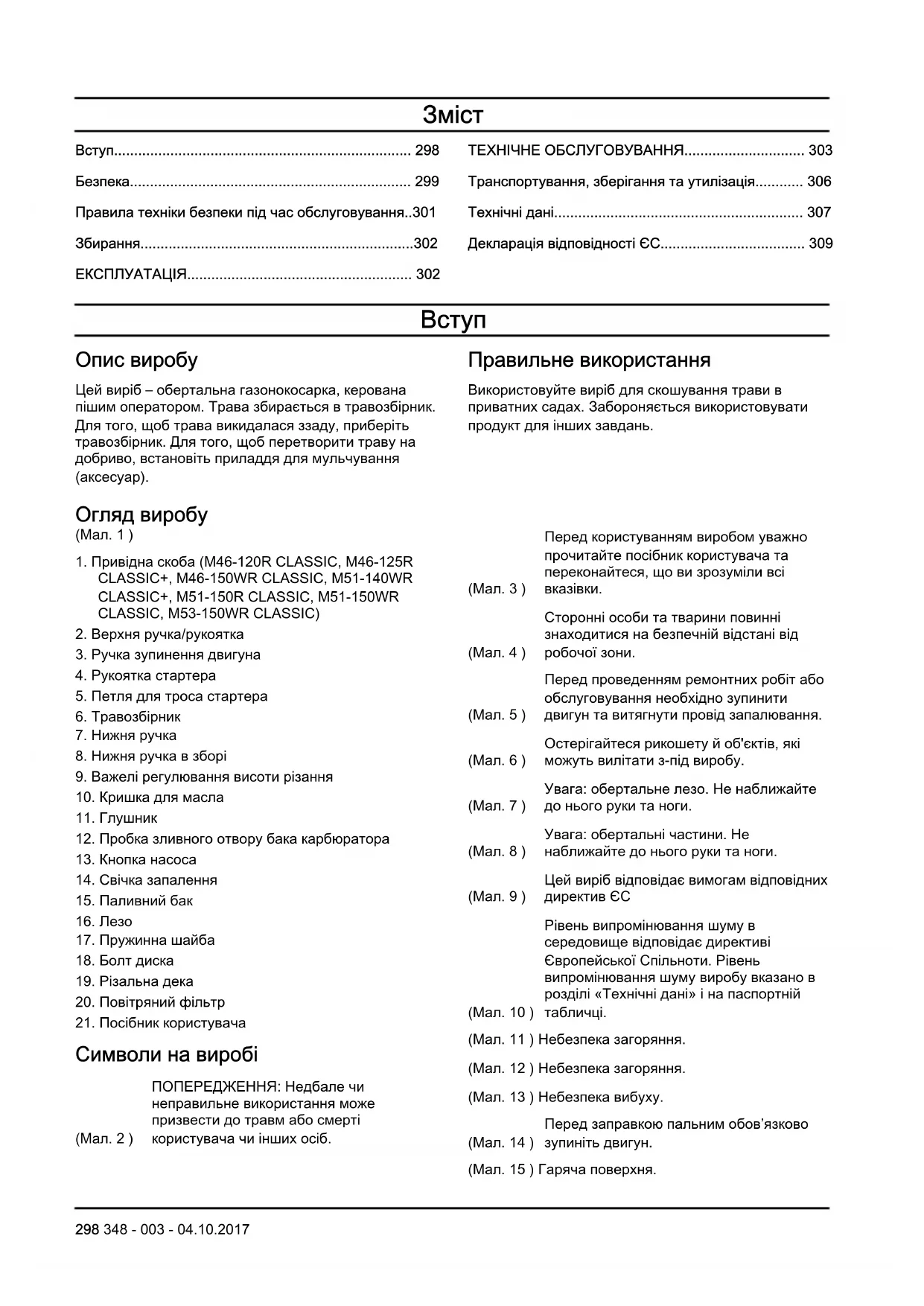 (Мал. 4 ) Сторонні особи та тварини повинні знаходитися на безпечній відстані від робочої зони. (Мал. 5 ) Перед проведенням ремонтних робіт або обслуговування необхідно зупинити двигун та витягнути провід запалювання. (Мал. 6 ) Остерігайтеся рикошету й об'єктів, які можуть вилітати з-під виробу. (Мал. 7 ) Увага: обертальне лезо. Не наближайте до нього руки та ноги. (Мал. 8 ) Увага: обертальні частини. Не наближайте до нього руки та ноги. (Мал. 9 ) Цей виріб відповідає вимогам відповідних директив ЄС (Мал. 10 ) Рівень випромінювання шуму в середовище відповідає директиві Європейської Спільноти. Рівень випромінювання шуму виробу вказано в розділі «Технічні дані» і на паспортній