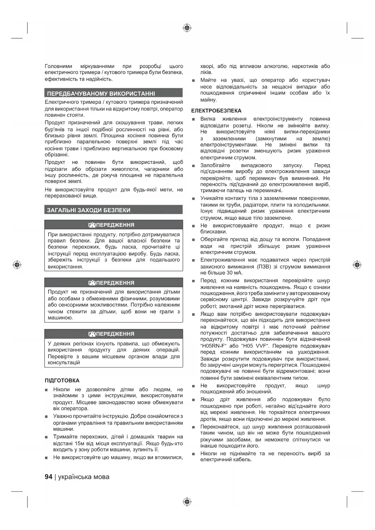 Продукт не повинен бути використаний, щоб підрізати або обрізати живоплоти, чагарники або іншу рослинність, де ріжуча площина не паралельна поверхні землі. Не використовуйте продукт для будь-якої мети, не перерахованої вище. ЗАГАЛЬНІ ЗАХОДИ БЕЗПЕКИ ПОПЕРЕДЖЕННЯ При використанні продукту, потрібно дотримуватися правил безпеки. Для вашої власної безпеки та безпеки перехожих, будь ласка, прочитайте ці інструкції перед експлуатацією виробу. Будь ласка, збережіть інструкції з безпеки для подальшого використання. ПОПЕРЕДЖЕННЯ Продукт не призначений для використання дітьми або особами з обмеженими фізичними, розумовими або сенсорними можливостями. Потрібно належним чином стежити за дітьми, щоб вони не грали з