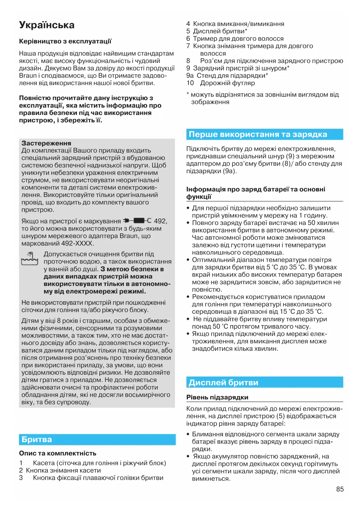 Якщо на пристрої є маркування 492, то його можна використовувати з будь-яким шнуром мережевого адаптера Braun, що маркований 492-ХХХХ. Допускається очищення бритви під проточною водою, а також використання у ванній або душі. З метою безпеки в даних випадках пристрій можна використовувати тільки в автономно- му від електромережі режимі. Не використовувати пристрій при пошкодженні сіточки для гоління та/або ріжучого блоку. Дітям у віці 8 років і старшим, особам з обмеже- ними фізичними, сенсорними та розумовими можливостями, а також тим, хто не має достат- нього досвіду або знань, дозволяється користу- ватися даним приладом тільки під наглядом, або після отримання роз’яснень про техніку безпеки при використанні приладу, за умови, що вони усвідомлюють відповідні ризики. Не дозволяйте дітям гратися з приладом. Не дозволяється здійснювати очисні та профілактичні роботи обладнання дітям, які не досягли восьмирічного віку, та без супроводу.